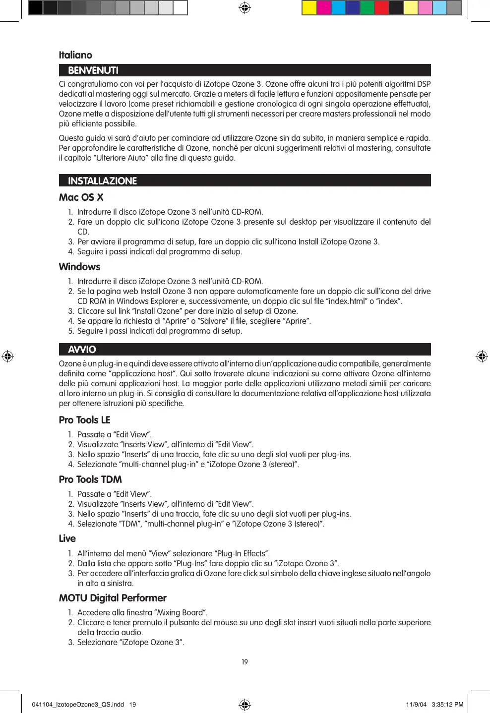 041104_IzotopeOzone3_QS.indd 18 11/9/04 3:35:12 PM Italiano BENVENUTI Ci congratuliamo con voi per l’acquisto di iZotope Ozone 3. Ozone offre alcuni tra i più potenti algoritmi DSP dedicati al mastering oggi sul mercato. Grazie a meters di facile lettura e funzioni appositamente pensate per velocizzare il lavoro (come preset richiamabili e gestione cronologica di ogni singola operazione effettuata), Ozone mette a disposizione dell’utente tutti gli strumenti necessari per creare masters professionali nel modo più efficiente possibile. Questa guida vi sarà d’aiuto per cominciare ad utilizzare Ozone sin da subito, in maniera semplice e rapida. Per approfondire le caratteristiche di Ozone, nonché per alcuni suggerimenti relativi al mastering, consultate il capitolo “Ulteriore Aiuto” alla fine di questa guida. INSTALLAZIONE Mac OS X