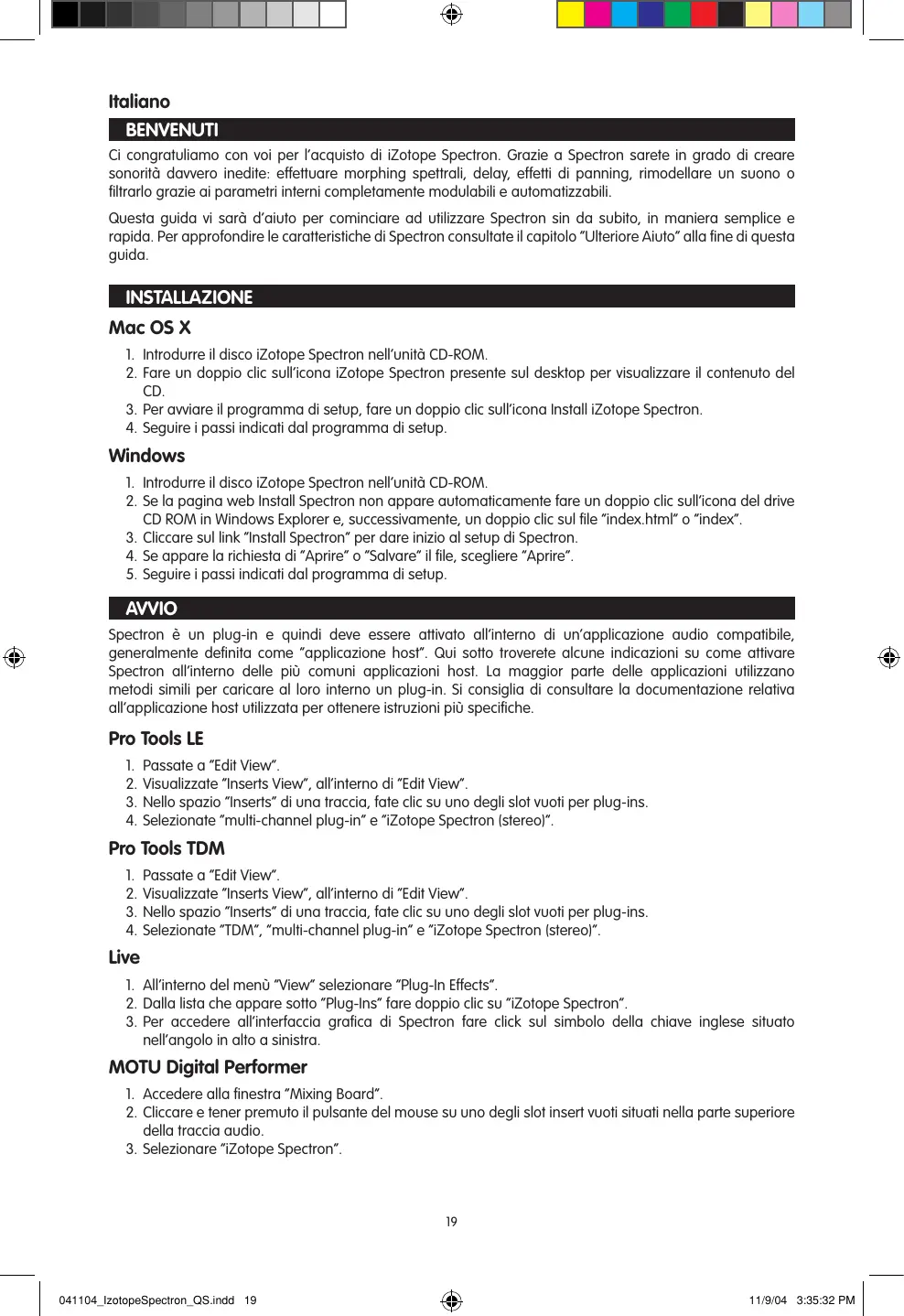 041104_IzotopeSpectron_QS.indd 17 11/9/04 3:35:32 PM Italiano BENVENUTI Ci congratuliamo con voi per l’acquisto di iZotope Spectron. Grazie a Spectron sarete in grado di creare sonorità davvero inedite: effettuare morphing spettrali, delay, effetti di panning, rimodellare un suono o filtrarlo grazie ai parametri interni completamente modulabili e automatizzabili. Questa guida vi sarà d’aiuto per cominciare ad utilizzare Spectron sin da subito, in maniera semplice e rapida. Per approfondire le caratteristiche di Spectron consultate il capitolo “Ulteriore Aiuto” alla fine di questa guida. INSTALLAZIONE Mac OS X