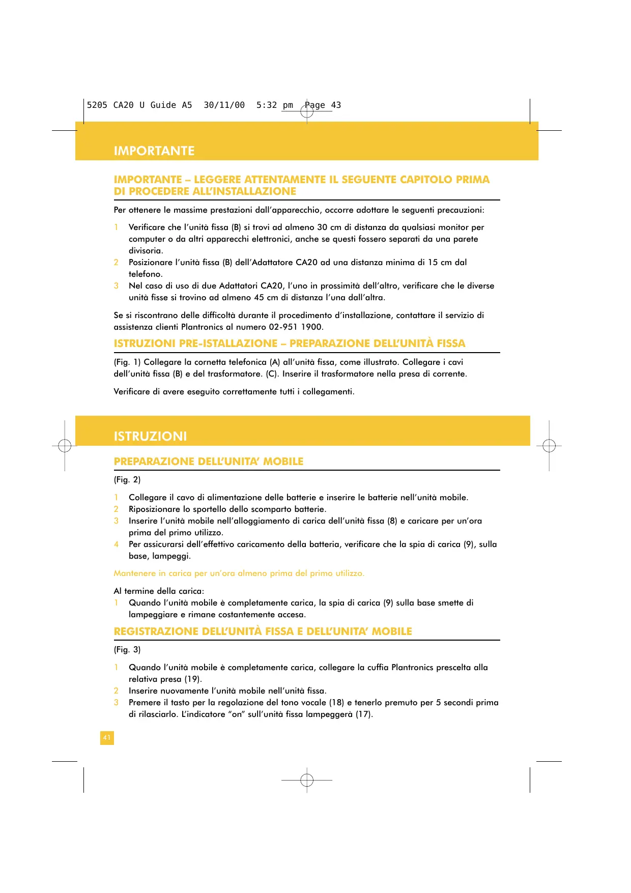 Verificare che l’unità fissa (B) si trovi ad almeno 30 cm di distanza da qualsiasi monitor per computer o da altri apparecchi elettronici, anche se questi fossero separati da una parete divisoria. Posizionare l’unità fissa (B) dell’Adattatore CA20 ad una distanza minima di 15 cm dal telefono. Nel caso di uso di due Adattatori CA20, l’uno in prossimità dell’altro, verificare che le diverse unità fisse si trovino ad almeno 45 cm di distanza l’una dall’altra. Se si riscontrano delle difficoltà durante il procedimento d’installazione, contattare il servizio di assistenza clienti Plantronics al numero 02-951 1900.