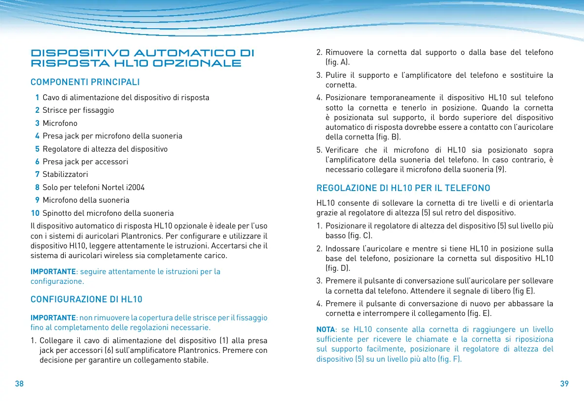 cornetta e interrompere il collegamento (fig. E). fino al completamento delle regolazioni necessarie. NOTA: se HL10 consente alla cornetta di raggiungere un livello