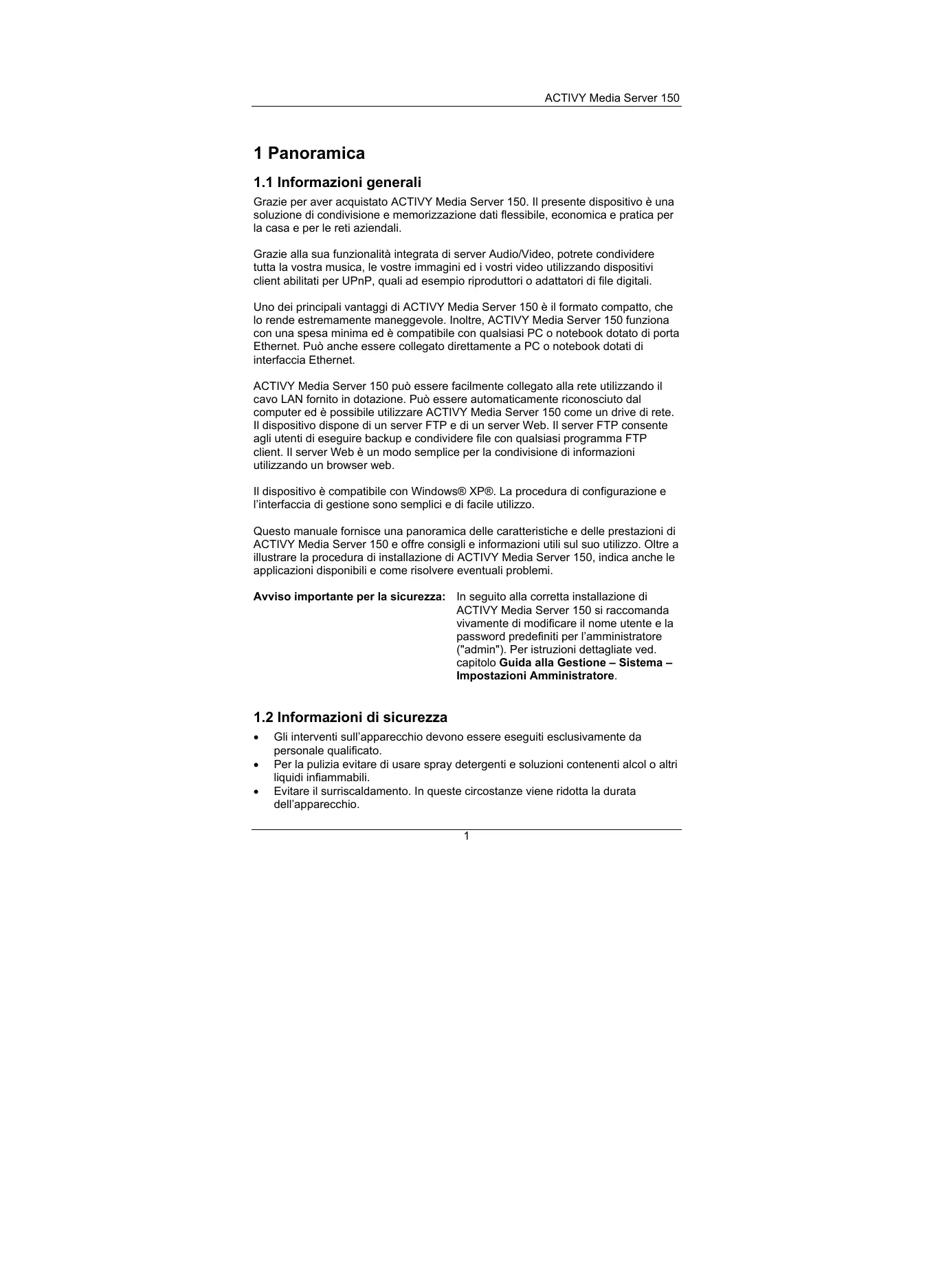Grazie per aver acquistato ACTIVY Media Server 150. Il presente dispositivo è una soluzione di condivisione e memorizzazione dati flessibile, economica e pratica per la casa e per le reti aziendali. Grazie alla sua funzionalità integrata di server Audio/Video, potrete condividere tutta la vostra musica, le vostre immagini ed i vostri video utilizzando dispositivi client abilitati per UPnP, quali ad esempio riproduttori o adattatori di file digitali. Uno dei principali vantaggi di ACTIVY Media Server 150 è il formato compatto, che lo rende estremamente maneggevole. Inoltre, ACTIVY Media Server 150 funziona con una spesa minima ed è compatibile con qualsiasi PC o notebook dotato di porta Ethernet. Può anche essere collegato direttamente a PC o notebook dotati di interfaccia Ethernet. ACTIVY Media Server 150 può essere facilmente collegato alla rete utilizzando il cavo LAN fornito in dotazione. Può essere automaticamente riconosciuto dal computer ed è possibile utilizzare ACTIVY Media Server 150 come un drive di rete. Il dispositivo dispone di un server FTP e di un server Web. Il server FTP consente agli utenti di eseguire backup e condividere file con qualsiasi programma FTP client. Il server Web è un modo semplice per la condivisione di informazioni utilizzando un browser web. Il dispositivo è compatibile con Windows® XP®. La procedura di configurazione e l’interfaccia di gestione sono semplici e di facile utilizzo. Questo manuale fornisce una panoramica delle caratteristiche e delle prestazioni di ACTIVY Media Server 150 e offre consigli e informazioni utili sul suo utilizzo. Oltre a illustrare la procedura di installazione di ACTIVY Media Server 150, indica anche le applicazioni disponibili e come risolvere eventuali problemi. Avviso importante per la sicurezza: In seguito alla corretta installazione di ACTIVY Media Server 150 si raccomanda vivamente di modificare il nome utente e la password predefiniti per l’amministratore ("admin"). Per istruzioni dettagliate ved. capitolo Guida alla Gestione – Sistema – Impostazioni Amministratore.