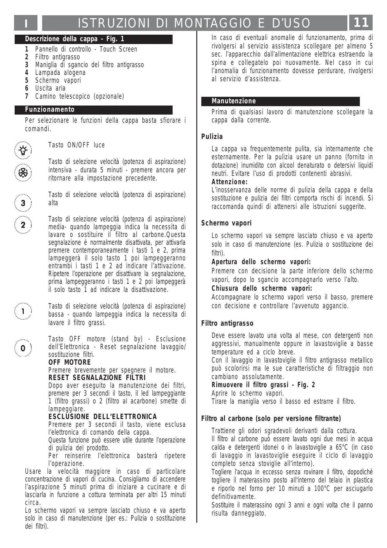 GB I ISTRUZIONI DI MONTAGGIO E D’USO Descrizione della cappa - Fig. 1 1 Pannello di controllo - Touch Screen 2 Filtro antigrasso 3 Maniglia di sgancio del filtro antigrasso 4 Lampada alogena 5 Schermo vapori 6 Uscita aria 7 Camino telescopico (opzionale) Funzionamento Per selezionare le funzioni della cappa basta sfiorare i comandi.