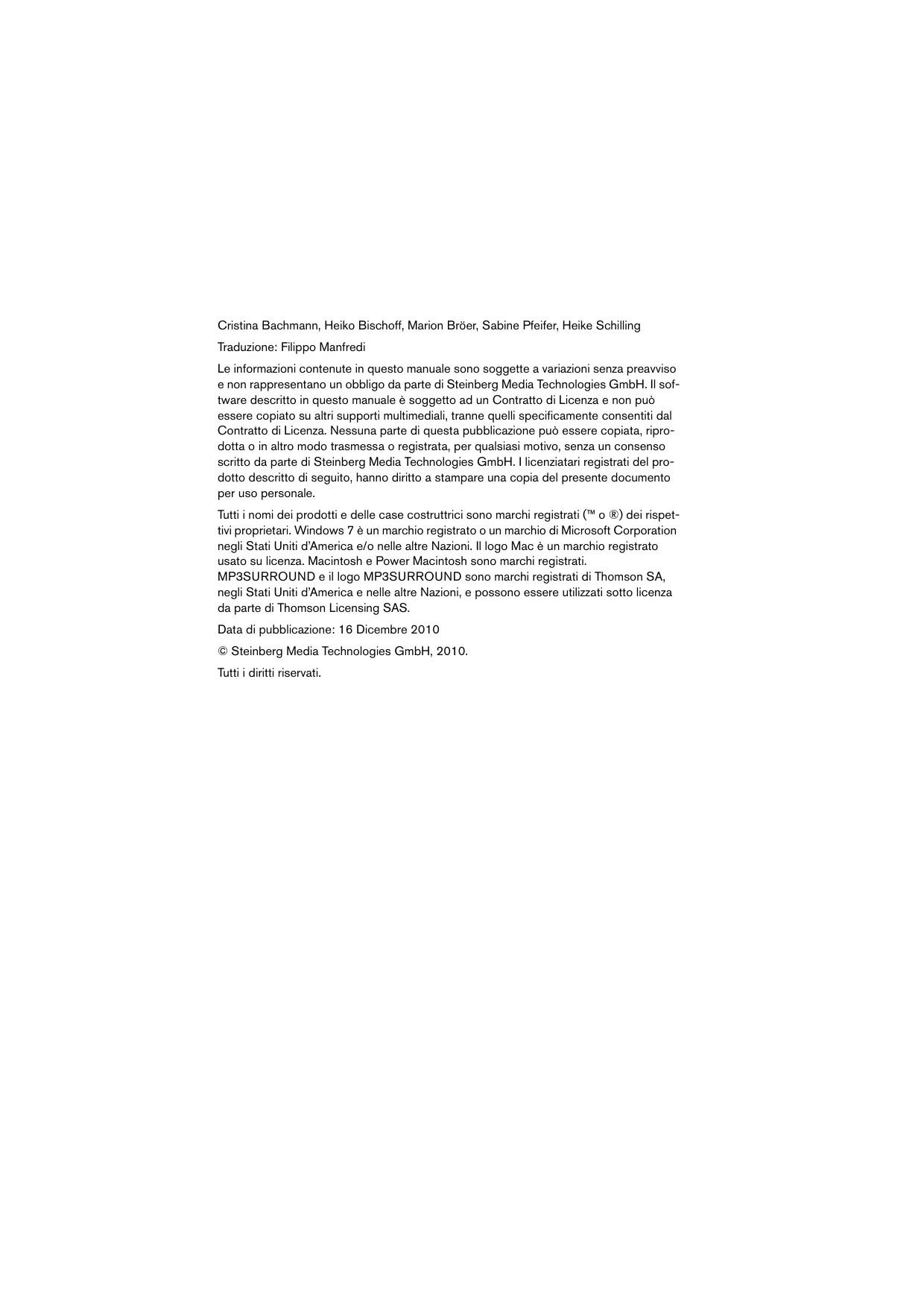 Votre fichier audio est exporté à l’emplacement défini et importé sur une nouvelle piste audio dans votre projet. Pour vérifier le son de votre mixage audio, vous pouvez lire cette piste en solo. 121 — Mixage et effets ITALIANO Italiano Cristina Bachmann, Heiko Bischoff, Marion Bröer, Sabine Pfeifer, Heike Schilling Traduzione: Filippo Manfredi Le informazioni contenute in questo manuale sono soggette a variazioni senza preavviso e non rappresentano un obbligo da parte di Steinberg Media Technologies GmbH. Il software descritto in questo manuale è soggetto ad un Contratto di Licenza e non può essere copiato su altri supporti multimediali, tranne quelli specificamente consentiti dal Contratto di Licenza. Nessuna parte di questa pubblicazione può essere copiata, riprodotta o in altro modo trasmessa o registrata, per qualsiasi motivo, senza un consenso scritto da parte di Steinberg Media Technologies GmbH. I licenziatari registrati del prodotto descritto di seguito, hanno diritto a stampare una copia del presente documento per uso personale. Tutti i nomi dei prodotti e delle case costruttrici sono marchi registrati (™ o ®) dei rispettivi proprietari. Windows 7 è un marchio registrato o un marchio di Microsoft Corporation negli Stati Uniti d’America e/o nelle altre Nazioni. Il logo Mac è un marchio registrato usato su licenza. Macintosh e Power Macintosh sono marchi registrati. MP3SURROUND e il logo MP3SURROUND sono marchi registrati di Thomson SA, negli Stati Uniti d’America e nelle altre Nazioni, e possono essere utilizzati sotto licenza da parte di Thomson Licensing SAS. Data di pubblicazione: 16 Dicembre 2010 © Steinberg Media Technologies GmbH, 2010. Tutti i diritti riservati. ITALIANO Indice