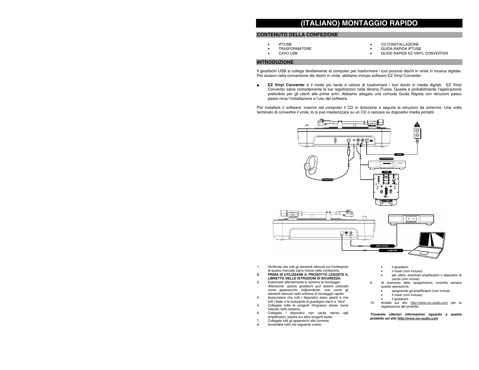 Verificate che tutti gli elementi elencati sul frontespizio di questo manuale siano inclusi nella confezione. PRIMA DI UTILIZZARE IL PRODOTTO LEGGETE IL LIBRETTO DELLE ISTRUZIONI DI SICUREZZA. Esaminate attentamente lo schema di montaggio. Attenzione: questo giradischi può essere utilizzato come apparecchio indipendente, così come gli elementi elencati nello schema di montaggio rapido. Assicuratevi che tutti i dispositivi siano spenti e che tutti i fader e le manopole di guadagno siano a "zero”. Collegate tutte le sorgenti d'ingresso stereo come indicato nello schema. Collegate i dispositivi con uscita stereo agli amplificatori, piastre e/o altre sorgenti audio. Collegate tutti gli apparecchi alla corrente. Accendete tutto nel seguente ordine: