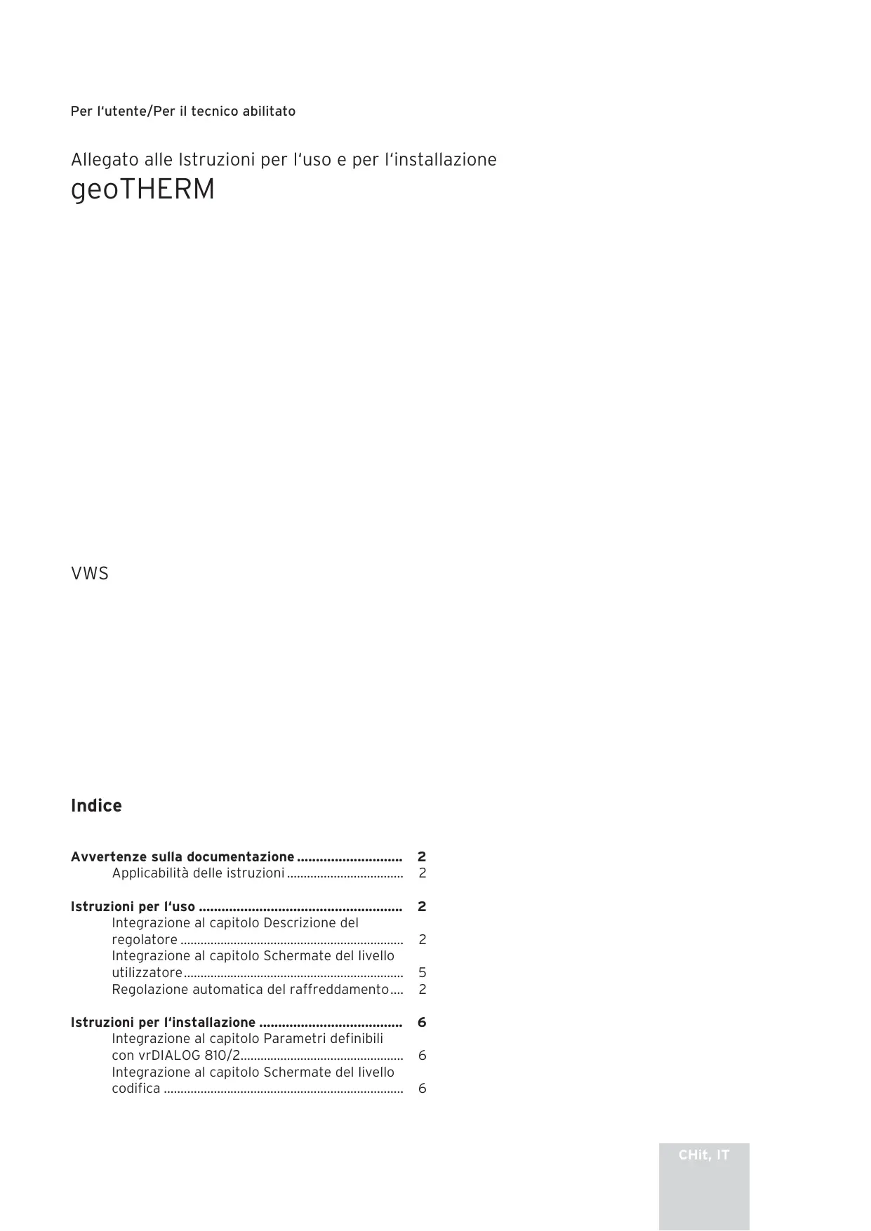 geoTHERM VWS Indice Avvertenze sulla documentazione 2 Applicabilità delle istruzioni 2 Istruzioni per l‘uso 2 Integrazione al capitolo Descrizione del regolatore 2 Integrazione al capitolo Schermate del livello utilizzatore 5 Regolazione automatica del raffreddamento .... 2 Istruzioni per l‘installazione 6 Integrazione al capitolo Parametri definibili con vrDIALOG 810/2 6 Integrazione al capitolo Schermate del livello codifica 6