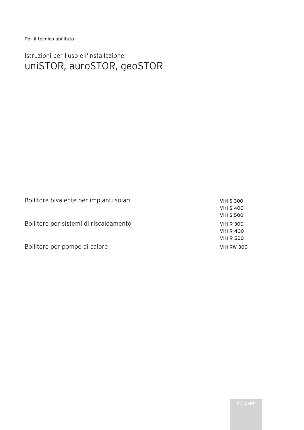 Per il tecnico abilitato Istruzioni per l‘uso e l‘installazione uniSTOR, auroSTOR, geoSTOR Bollitore bivalente per impianti solari VIH S 300 VIH S 400 VIH S 500 Bollitore per sistemi di riscaldamento VIH R 300 VIH R 400 VIH R 500 Bollitore per pompe di calore VIH RW 300 IT; CHIT Indice 1 Avvertenze sulla documentazione Indice