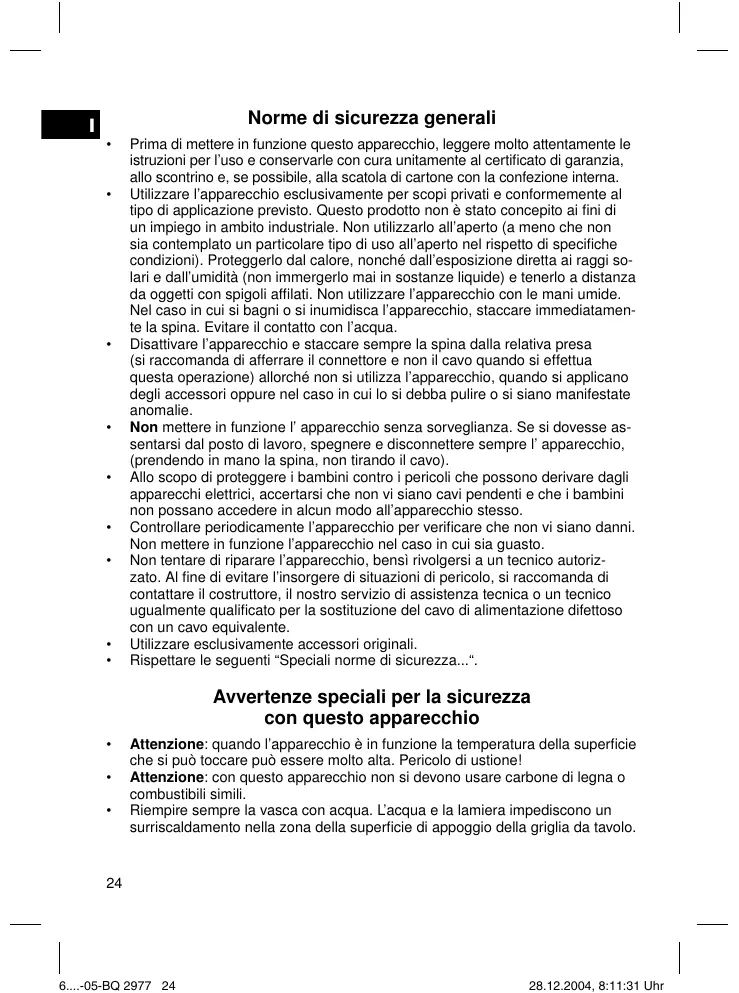 - Fare attentzione che il cavo di allacciamato alla rete elektrica non entr in contatto con parti calde dell'apparecchio. Non toccare le parti calde dell'apparecchio bensi use sono solo tasti e impugnature.