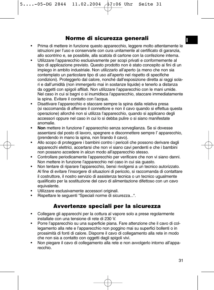 - Se l'apparecchio dovesse cadere in acqua, prima di tirarlo fuori staccare la spinal Poi non rimetterlo in funzione, ma farlo controllare da un centro assistenza autorizzato. Lo stesso discorso valeanche se il cavo di collegamento alla rete o l'apparecchio sono danneggiati o se l'apparecchio è caduto.