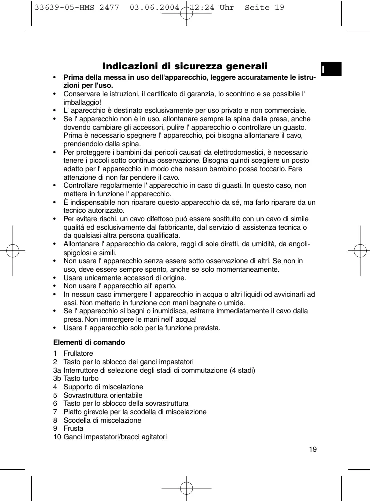 Prima della messa in uso dell'apparecchio, leggere accuratamente le istruzioni per l'uso. Conservare le istruzioni, il certificato di garanzia, lo scontrino e se possibile l' imballaggio! L' aparecchio è destinato esclusivamente per uso privato e non commerciale. Se l' apparecchio non è in uso, allontanare sempre la spina dalla presa, anche dovendo cambiare gli accessori, pulire l' apparecchio o controllare un guasto. Prima è necessario spegnere l' apparecchio, poi bisogna allontanare il cavo, prendendolo dalla spina. Per proteggere i bambini dai pericoli causati da elettrodomestici, è necessario tenere i piccoli sotto continua osservazione. Bisogna quindi scegliere un posto adatto per l' apparecchio in modo che nessun bambino possa toccarlo. Fare attenzione di non far pendere il cavo. Controllare regolarmente l' apparecchio in caso di guasti. In questo caso, non mettere in funzione l' apparecchio. È indispensabile non riparare questo apparecchio da sé, ma farlo riparare da un tecnico autorizzato. Per evitare rischi, un cavo difettoso puó essere sostituito con un cavo di simile qualitá ed esclusivamente dal fabbricante, dal servizio di assistenza tecnica o da qualsiasi altra persona qualificata. Allontanare l' apparecchio da calore, raggi di sole diretti, da umidità, da angolispigolosi e simili. Non usare l' apparecchio senza essere sotto osservazione di altri. Se non in uso, deve essere sempre spento, anche se solo momentaneamente. Usare unicamente accessori di origine. Non usare l' apparecchio all' aperto. In nessun caso immergere l' apparecchio in acqua o altri liquidi od avvicinarli ad essi. Non metterlo in funzione con mani bagnate o umide. Se l' apparecchio si bagni o inumidisca, estrarre immediatamente il cavo dalla presa. Non immergere le mani nell' acqua! Usare l' apparecchio solo per la funzione prevista. Elementi di comando