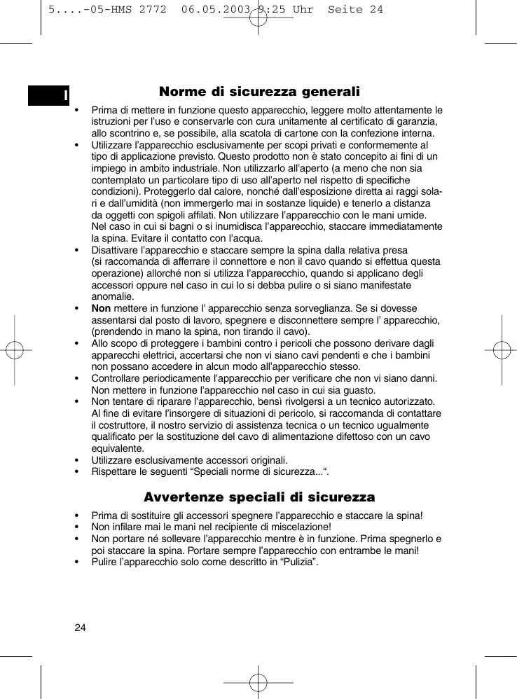 Prima di sostituire gli accessori spegnere l’apparecchio e staccare la spina! Non infilare mai le mani nel recipiente di miscelazione! Non portare né sollevare l’apparecchio mentre è in funzione. Prima spegnerlo e poi staccare la spina. Portare sempre l’apparecchio con entrambe le mani! Pulire l’apparecchio solo come descritto in “Pulizia”. 5....-05-HMS 2772