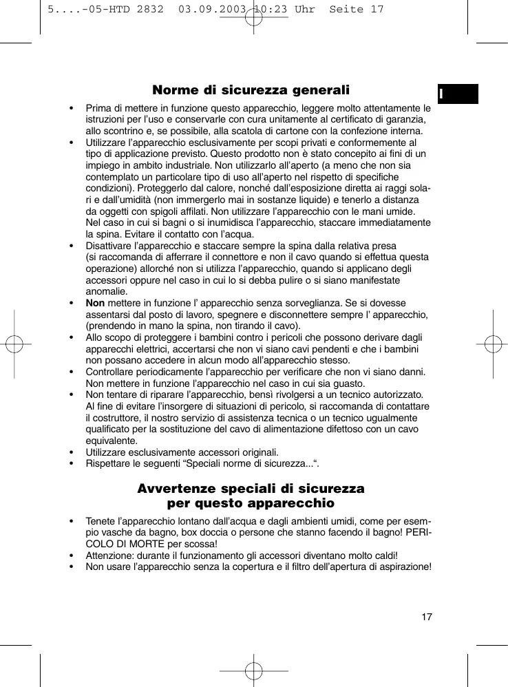 Non mettere in funzione l'apparechio这么久 sorveglianza. Se si dovesse assentarsi dal dato di lavoro, spegnere e disconnettere sempre l'apparechio, (predendendo in mano la spina, non tirando il cavo). - Allo scopo di proteggere i bambini contro i pericoli che sono derivare dagli apparentecchi elettrici, accertarsi che non vi siano cavi pendenti e che i bambini non possano accederne in alcun modo all'apparechioesso.
