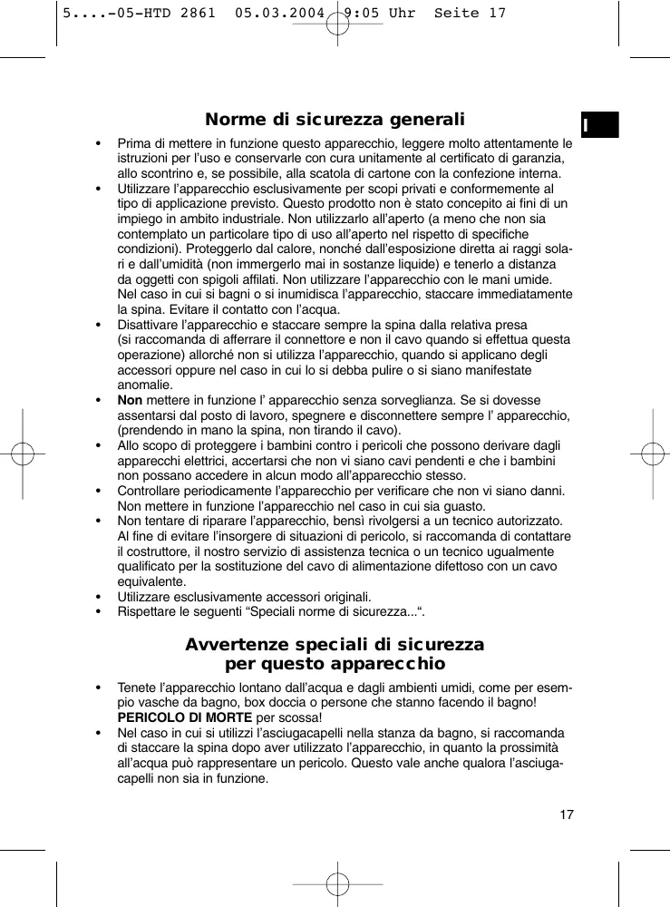 - Nel caso in cui si utilizes l'asciugacapelli nella stanza da bagno, si raccomanda di staccare la spina dopo aver utilizzato l'apparechio, in quanto la prossimità all'acqua più rappresentare un pericolò. Questo valeanche qualora l'asciugacapelli non sia in funzione.