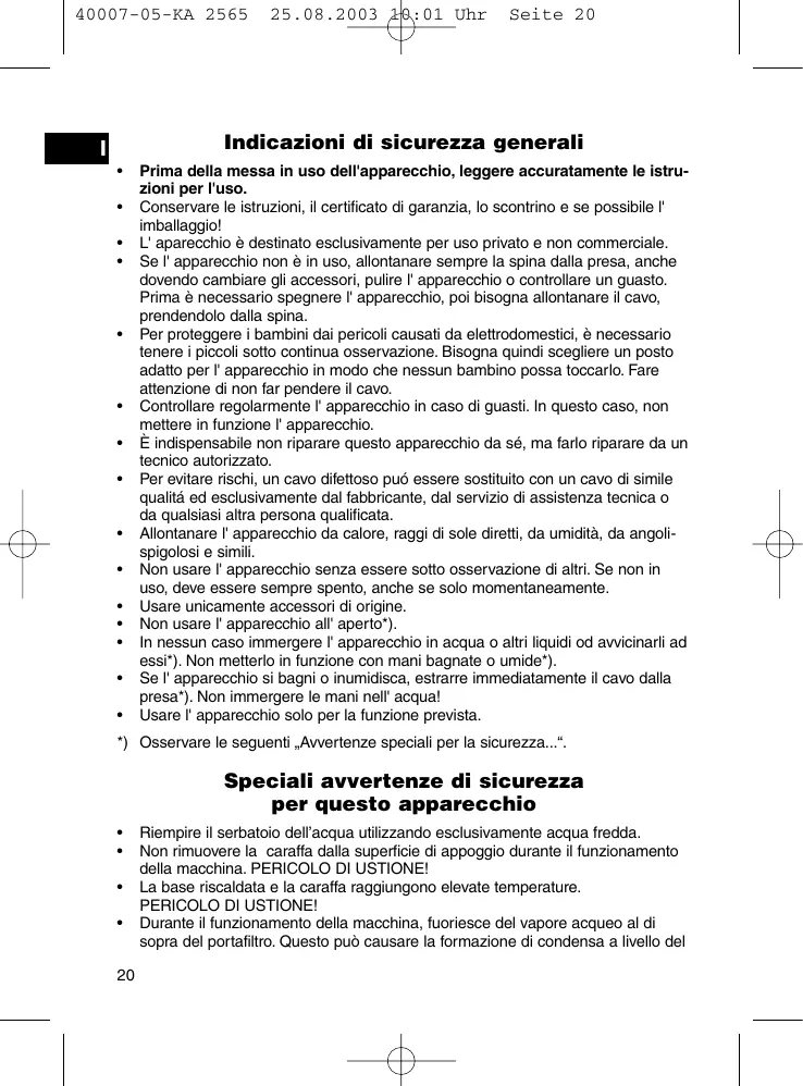 Prima della messa in uso dell'apparecchio, leggere accuratamente le istruzioni per l'uso. Conservare le istruzioni, il certificato di garanzia, lo scontrino e se possibile l' imballaggio! L' aparecchio è destinato esclusivamente per uso privato e non commerciale. Se l' apparecchio non è in uso, allontanare sempre la spina dalla presa, anche dovendo cambiare gli accessori, pulire l' apparecchio o controllare un guasto. Prima è necessario spegnere l' apparecchio, poi bisogna allontanare il cavo, prendendolo dalla spina. Per proteggere i bambini dai pericoli causati da elettrodomestici, è necessario tenere i piccoli sotto continua osservazione. Bisogna quindi scegliere un posto adatto per l' apparecchio in modo che nessun bambino possa toccarlo. Fare attenzione di non far pendere il cavo. Controllare regolarmente l' apparecchio in caso di guasti. In questo caso, non mettere in funzione l' apparecchio. È indispensabile non riparare questo apparecchio da sé, ma farlo riparare da un tecnico autorizzato. Per evitare rischi, un cavo difettoso puó essere sostituito con un cavo di simile qualitá ed esclusivamente dal fabbricante, dal servizio di assistenza tecnica o da qualsiasi altra persona qualificata. Allontanare l' apparecchio da calore, raggi di sole diretti, da umidità, da angolispigolosi e simili. Non usare l' apparecchio senza essere sotto osservazione di altri. Se non in uso, deve essere sempre spento, anche se solo momentaneamente. Usare unicamente accessori di origine. Non usare l' apparecchio all' aperto*). In nessun caso immergere l' apparecchio in acqua o altri liquidi od avvicinarli ad essi*). Non metterlo in funzione con mani bagnate o umide*). Se l' apparecchio si bagni o inumidisca, estrarre immediatamente il cavo dalla presa*). Non immergere le mani nell' acqua! Usare l' apparecchio solo per la funzione prevista.