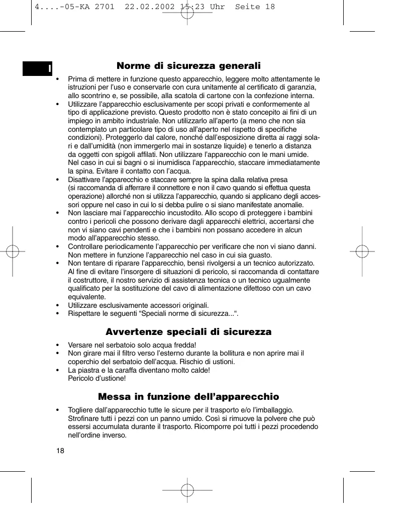 Prima di mettere in funzione questo apparecchio, leggere molto attentamente le istruzioni per l’uso e conservarle con cura unitamente al certificato di garanzia, allo scontrino e, se possibile, alla scatola di cartone con la confezione interna. Utilizzare l’apparecchio esclusivamente per scopi privati e conformemente al tipo di applicazione previsto. Questo prodotto non è stato concepito ai fini di un impiego in ambito industriale. Non utilizzarlo all’aperto (a meno che non sia contemplato un particolare tipo di uso all’aperto nel rispetto di specifiche condizioni). Proteggerlo dal calore, nonché dall’esposizione diretta ai raggi solari e dall’umidità (non immergerlo mai in sostanze liquide) e tenerlo a distanza da oggetti con spigoli affilati. Non utilizzare l’apparecchio con le mani umide. Nel caso in cui si bagni o si inumidisca l’apparecchio, staccare immediatamente la spina. Evitare il contatto con l’acqua. Disattivare l’apparecchio e staccare sempre la spina dalla relativa presa (si raccomanda di afferrare il connettore e non il cavo quando si effettua questa operazione) allorché non si utilizza l’apparecchio, quando si applicano degli accessori oppure nel caso in cui lo si debba pulire o si siano manifestate anomalie. Non lasciare mai l’apparecchio incustodito. Allo scopo di proteggere i bambini contro i pericoli che possono derivare dagli apparecchi elettrici, accertarsi che non vi siano cavi pendenti e che i bambini non possano accedere in alcun modo all’apparecchio stesso. Controllare periodicamente l’apparecchio per verificare che non vi siano danni. Non mettere in funzione l’apparecchio nel caso in cui sia guasto. Non tentare di riparare l’apparecchio, bensì rivolgersi a un tecnico autorizzato. Al fine di evitare l’insorgere di situazioni di pericolo, si raccomanda di contattare il costruttore, il nostro servizio di assistenza tecnica o un tecnico ugualmente qualificato per la sostituzione del cavo di alimentazione difettoso con un cavo equivalente. Utilizzare esclusivamente accessori originali. Rispettare le seguenti “Speciali norme di sicurezza...“.