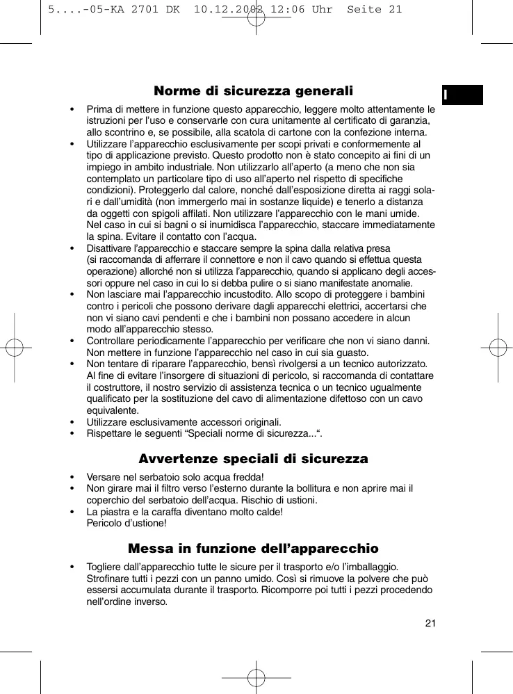 I Prima di mettere in funzione questo apparecchio, leggere molto attentamente le istruzioni per l’uso e conservarle con cura unitamente al certificato di garanzia, allo scontrino e, se possibile, alla scatola di cartone con la confezione interna. Utilizzare l’apparecchio esclusivamente per scopi privati e conformemente al tipo di applicazione previsto. Questo prodotto non è stato concepito ai fini di un impiego in ambito industriale. Non utilizzarlo all’aperto (a meno che non sia contemplato un particolare tipo di uso all’aperto nel rispetto di specifiche condizioni). Proteggerlo dal calore, nonché dall’esposizione diretta ai raggi solari e dall’umidità (non immergerlo mai in sostanze liquide) e tenerlo a distanza da oggetti con spigoli affilati. Non utilizzare l’apparecchio con le mani umide. Nel caso in cui si bagni o si inumidisca l’apparecchio, staccare immediatamente la spina. Evitare il contatto con l’acqua. Disattivare l’apparecchio e staccare sempre la spina dalla relativa presa (si raccomanda di afferrare il connettore e non il cavo quando si effettua questa operazione) allorché non si utilizza l’apparecchio, quando si applicano degli accessori oppure nel caso in cui lo si debba pulire o si siano manifestate anomalie. Non lasciare mai l’apparecchio incustodito. Allo scopo di proteggere i bambini contro i pericoli che possono derivare dagli apparecchi elettrici, accertarsi che non vi siano cavi pendenti e che i bambini non possano accedere in alcun modo all’apparecchio stesso. Controllare periodicamente l’apparecchio per verificare che non vi siano danni. Non mettere in funzione l’apparecchio nel caso in cui sia guasto. Non tentare di riparare l’apparecchio, bensì rivolgersi a un tecnico autorizzato. Al fine di evitare l’insorgere di situazioni di pericolo, si raccomanda di contattare il costruttore, il nostro servizio di assistenza tecnica o un tecnico ugualmente qualificato per la sostituzione del cavo di alimentazione difettoso con un cavo equivalente. Utilizzare esclusivamente accessori originali. Rispettare le seguenti “Speciali norme di sicurezza...“.