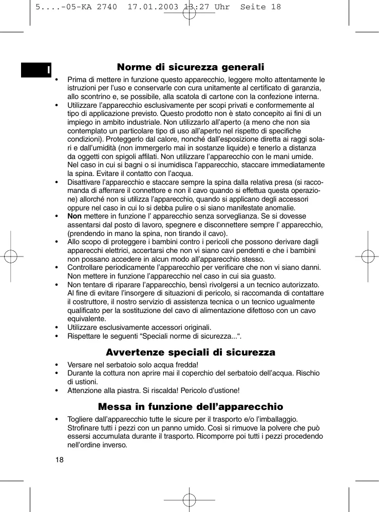 Prima di mettere in funzione questo apparecchio, leggere molto attentamente le istruzioni per l’uso e conservarle con cura unitamente al certificato di garanzia, allo scontrino e, se possibile, alla scatola di cartone con la confezione interna. Utilizzare l’apparecchio esclusivamente per scopi privati e conformemente al tipo di applicazione previsto. Questo prodotto non è stato concepito ai fini di un impiego in ambito industriale. Non utilizzarlo all’aperto (a meno che non sia contemplato un particolare tipo di uso all’aperto nel rispetto di specifiche condizioni). Proteggerlo dal calore, nonché dall’esposizione diretta ai raggi solari e dall’umidità (non immergerlo mai in sostanze liquide) e tenerlo a distanza da oggetti con spigoli affilati. Non utilizzare l’apparecchio con le mani umide. Nel caso in cui si bagni o si inumidisca l’apparecchio, staccare immediatamente la spina. Evitare il contatto con l’acqua. Disattivare l’apparecchio e staccare sempre la spina dalla relativa presa (si raccomanda di afferrare il connettore e non il cavo quando si effettua questa operazione) allorché non si utilizza l’apparecchio, quando si applicano degli accessori oppure nel caso in cui lo si debba pulire o si siano manifestate anomalie. Non mettere in funzione l’ apparecchio senza sorveglianza. Se si dovesse assentarsi dal posto di lavoro, spegnere e disconnettere sempre l’ apparecchio, (prendendo in mano la spina, non tirando il cavo). Allo scopo di proteggere i bambini contro i pericoli che possono derivare dagli apparecchi elettrici, accertarsi che non vi siano cavi pendenti e che i bambini non possano accedere in alcun modo all’apparecchio stesso. Controllare periodicamente l’apparecchio per verificare che non vi siano danni. Non mettere in funzione l’apparecchio nel caso in cui sia guasto. Non tentare di riparare l’apparecchio, bensì rivolgersi a un tecnico autorizzato. Al fine di evitare l’insorgere di situazioni di pericolo, si raccomanda di contattare il costruttore, il nostro servizio di assistenza tecnica o un tecnico ugualmente qualificato per la sostituzione del cavo di alimentazione difettoso con un cavo equivalente. Utilizzare esclusivamente accessori originali. Rispettare le seguenti “Speciali norme di sicurezza...“.