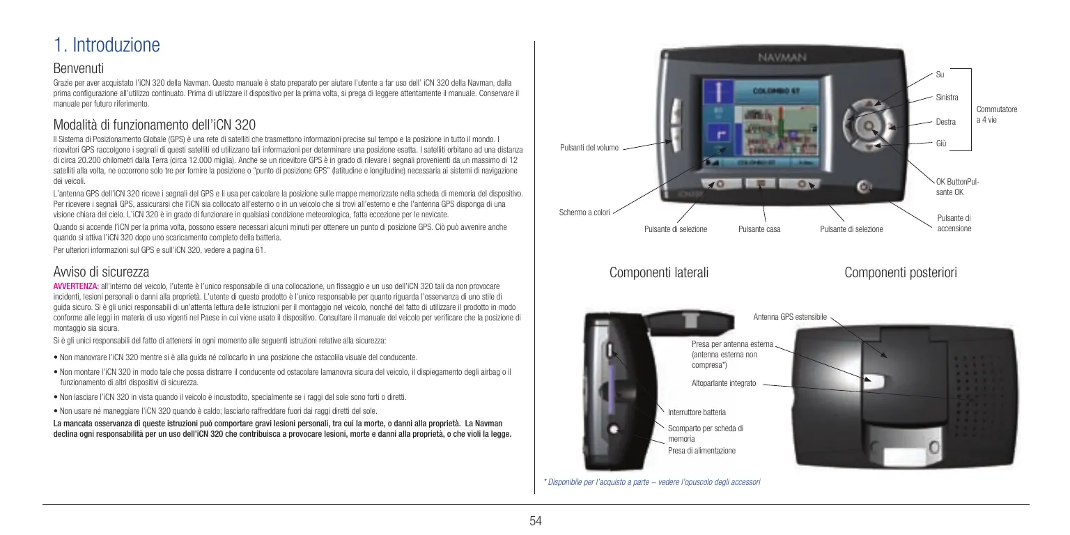 Grazie per aver acquistato l’iCN 320 della Navman. Questo manuale è stato preparato per aiutare l’utente a far uso dell’ iCN 320 della Navman, dalla prima configurazione all’utilizzo continuato. Prima di utilizzare il dispositivo per la prima volta, si prega di leggere attentamente il manuale. Conservare il manuale per futuro riferimento. Sinistra Modalità di funzionamento dell’iCN 320 Destra Il Sistema di Posizionamento Globale (GPS) è una rete di satelliti che trasmettono informazioni precise sul tempo e la posizione in tutto il mondo. I ricevitori GPS raccolgono i segnali di questi satelliti ed utilizzano tali informazioni per determinare una posizione esatta. I satelliti orbitano ad una distanza di circa 20.200 chilometri dalla Terra (circa 12.000 miglia). Anche se un ricevitore GPS è in grado di rilevare i segnali provenienti da un massimo di 12 satelliti alla volta, ne occorrono solo tre per fornire la posizione o “punto di posizione GPS” (latitudine e longitudine) necessaria ai sistemi di navigazione dei veicoli. L’antenna GPS dell’iCN 320 riceve i segnali del GPS e li usa per calcolare la posizione sulle mappe memorizzate nella scheda di memoria del dispositivo. Per ricevere i segnali GPS, assicurarsi che l’iCN sia collocato all’esterno o in un veicolo che si trovi all’esterno e che l’antenna GPS disponga di una visione chiara del cielo. L’iCN 320 è in grado di funzionare in qualsiasi condizione meteorologica, fatta eccezione per le nevicate. Quando si accende l’iCN per la prima volta, possono essere necessari alcuni minuti per ottenere un punto di posizione GPS. Ciò può avvenire anche quando si attiva l’iCN 320 dopo uno scaricamento completo della batteria. Per ulteriori informazioni sul GPS e sull’iCN 320, vedere a pagina 61. Commutatore a 4 vie Giù Pulsanti del volume OK ButtonPulsante OK Schermo a colori Pulsante di selezione Avviso di sicurezza Pulsante casa Pulsante di selezione Componenti laterali AVVERTENZA: all’interno del veicolo, l’utente è l’unico responsabile di una collocazione, un fissaggio e un uso dell’iCN 320 tali da non provocare incidenti, lesioni personali o danni alla proprietà. L’utente di questo prodotto è l’unico responsabile per quanto riguarda l’osservanza di uno stile di guida sicuro. Si è gli unici responsabili di un’attenta lettura delle istruzioni per il montaggio nel veicolo, nonché del fatto di utilizzare il prodotto in modo conforme alle leggi in materia di uso vigenti nel Paese in cui viene usato il dispositivo. Consultare il manuale del veicolo per verificare che la posizione di montaggio sia sicura. Si è gli unici responsabili del fatto di attenersi in ogni momento alle seguenti istruzioni relative alla sicurezza: Componenti posteriori Antenna GPS estensibile Presa per antenna esterna (antenna esterna non compresa*)