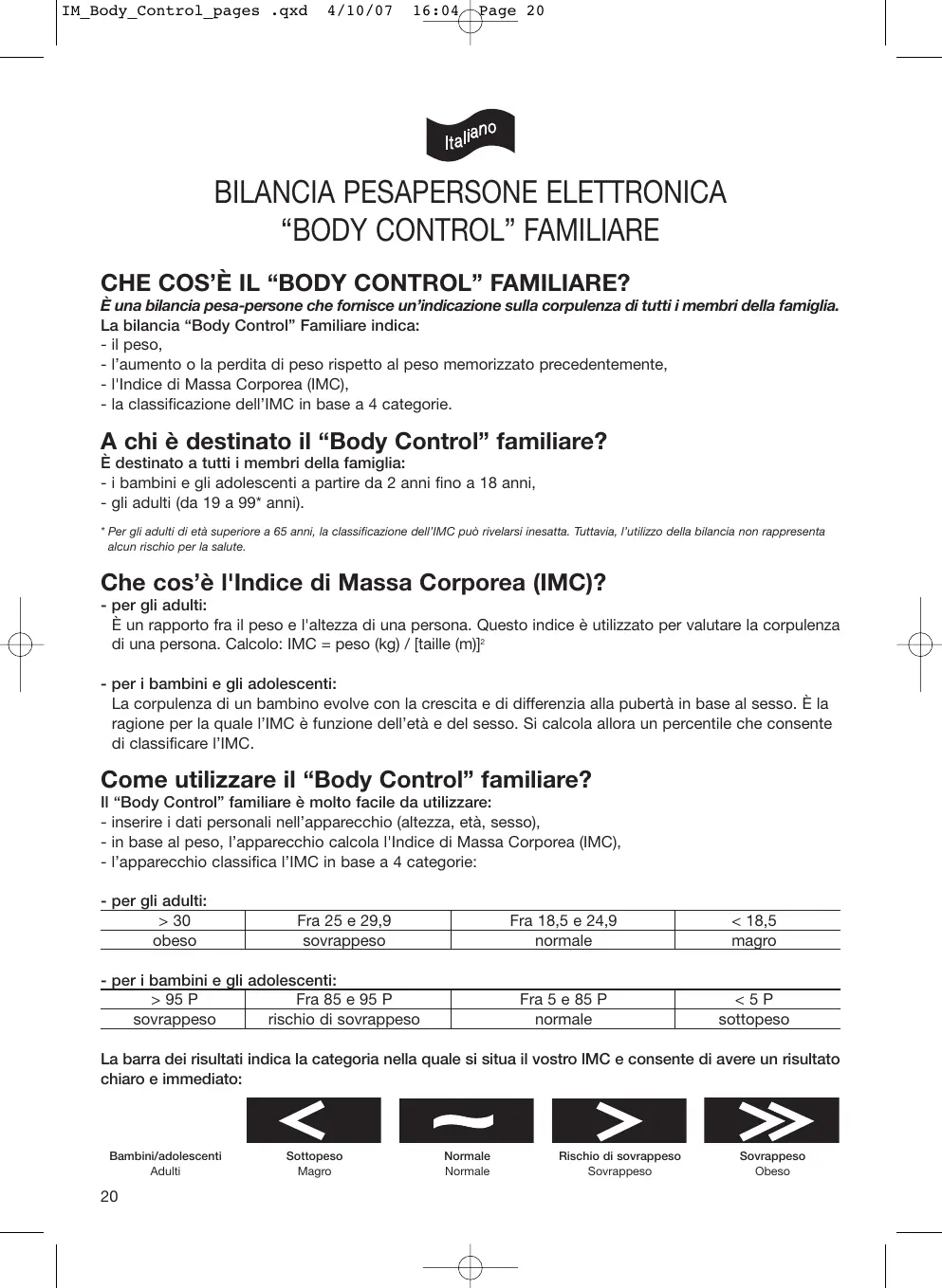Scarica le istruzioni per il tuo in formato PDF gratuitamente! Trova il tuo manuale FAMILY BODY CONTROL - TERRAILLON e riprendi in mano il tuo dispositivo elettronico. In questa pagina sono pubblicati tutti i documenti necessari per l'utilizzo del tuo dispositivo. FAMILY BODY CONTROL del marchio TERRAILLON.