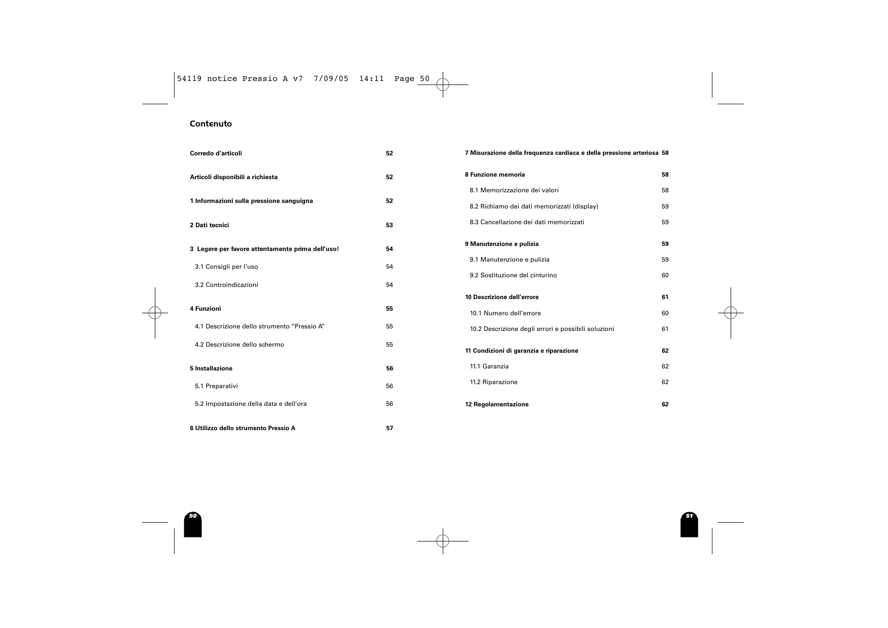Grazie al bracciale regolabile dell'apparecchio "Pressio A" che misura la vostra frequenza cardiaca e la vostra pressione arteriosa, avete a disposizione unsystema di misurazione di prim'ordine, che si affida ad una Tecnologia all'avanguardia, dall'utilizzo extremamente simplice e dall'ottima affidabilità. Vi ringraziamo per la vostra fiducia e restiamo a vostra completa disposizione per maggiori informazioni sull'assistenza e sul prodotto.