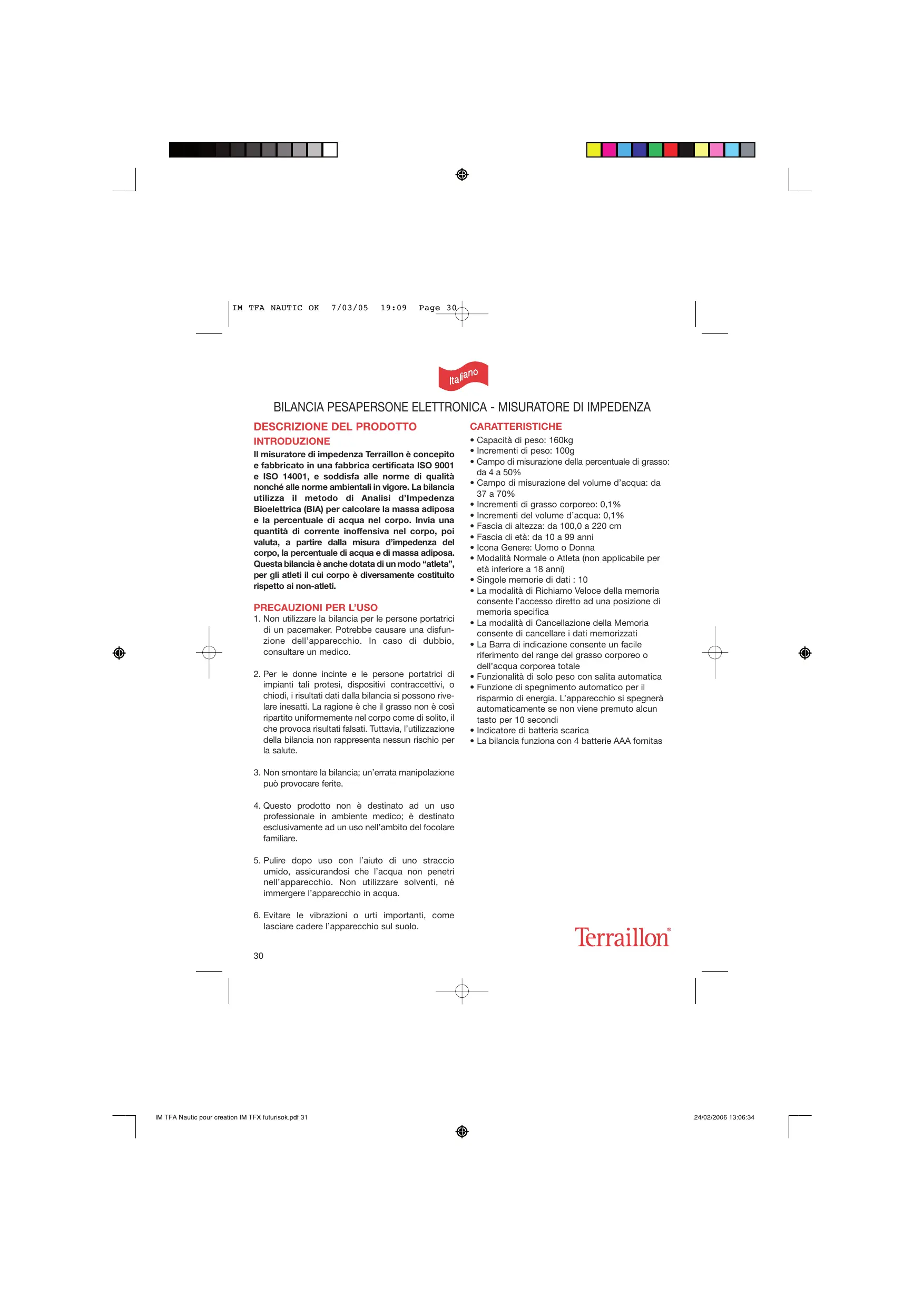 Il misuratore di impedenza Terraillon è concepito e fabbricato in una fabbrica certificata ISO 9001 e ISO 14001, e soddisfa alle norme di qualità nonché alle norme ambientali in vigore. La bilancia utilizza il metodo di Analisi d’Impedenza Bioelettrica (BIA) per calcolare la massa adiposa e la percentuale di acqua nel corpo. Invia una quantità di corrente inoffensiva nel corpo, poi valuta, a partire dalla misura d’impedenza del corpo, la percentuale di acqua e di massa adiposa. Questa bilancia è anche dotata di un modo “atleta”, per gli atleti il cui corpo è diversamente costituito rispetto ai non-atleti.