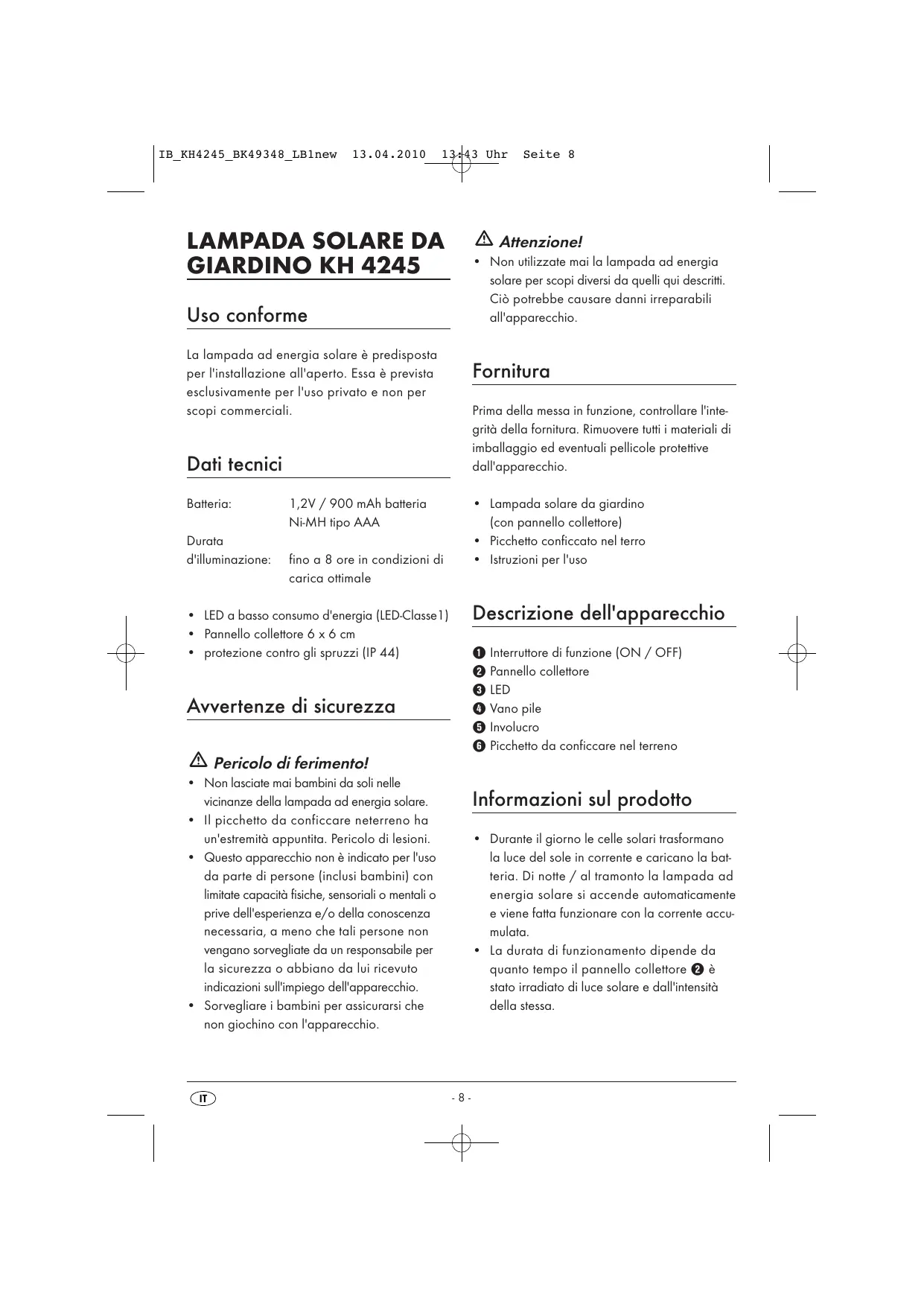 - protezione contro gli spruzzi (IP 44) 1 Interruttore di funzione (ON / OFF) 2 Pannello collettore 3 LED 4 Vano pile 5 Involucro 6 Picchetto da conficcare nel terreno Avvertenze di sicurezza Pericolo di ferimento!