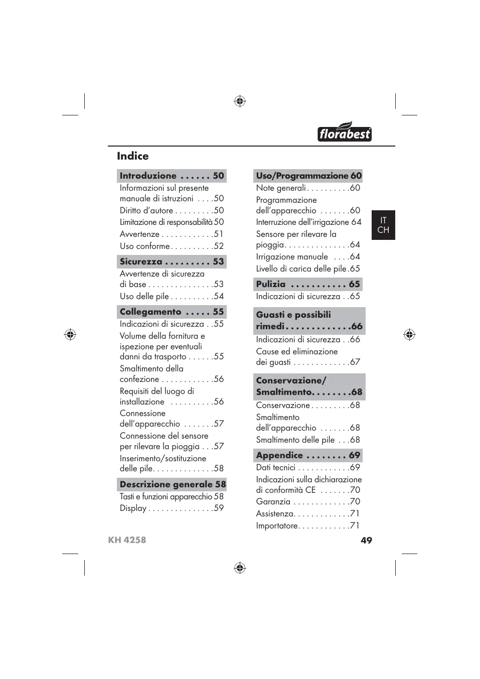 Il presente manuale di istruzioni è parte integrante della centralina d’irrigazione KH 4258 (di seguito denominata l’apparecchio) e fornisce informazioni importanti per l’uso conforme, la sicurezza, l’installazione e il collegamento dell’apparecchio. Il manuale di istruzioni dev’essere sempre disponibile nelle vicinanze dell’apparecchio. Esso dev’essere letto e applicato da tutti coloro che sono incaricati dell’uso e dell’eliminazione dei guasti dell’apparecchio. Conservare il presente manuale di istruzioni e consegnarlo insieme all’apparecchio in caso di cessione dello stesso a terzi. Diritto d’autore La presente documentazione è tutelata dal diritto d’autore. Qualsiasi riproduzione o ristampa, anche parziale, nonché la riproduzione delle illustrazioni, anche se modificate, è consentita solo previa autorizzazione scritta del produttore. Limitazione di responsabilità Tutte le informazioni tecniche contenute nel presente manuale di istruzioni, i dati e le indicazioni relativi all’installazione e al collegamento nonché all’uso, corrispondono allo stato più aggiornato al momento dell’invio in stampa e contengono le nostre esperienze e conoscenze più attuali. I dati, le illustrazioni e le descrizioni contenute nel presente manuale di istruzioni non costituiscono una base valida per alcun tipo di rivendicazione. Il produttore non si assume alcuna responsabilità per i danni derivanti dalla mancata osservanza delle istruzioni, dall’uso non conforme, dalle riparazioni non eseguite in modo professionale, dalle modifiche eseguite senza permesso o dall’impiego di pezzi di ricambio non omologati.