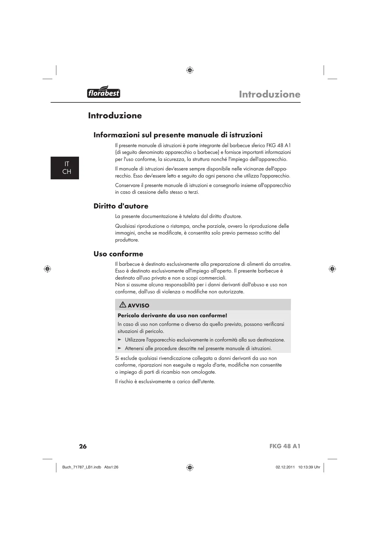 Introduzione Introduzione Informazioni sul presente manuale di istruzioni Il presente manuale di istruzioni è parte integrante del barbecue sferico FKG 48 A1 (di seguito denominato apparecchio o barbecue) e fornisce importanti informazioni per l'uso conforme, la sicurezza, la struttura nonché l'impiego dell'apparecchio.