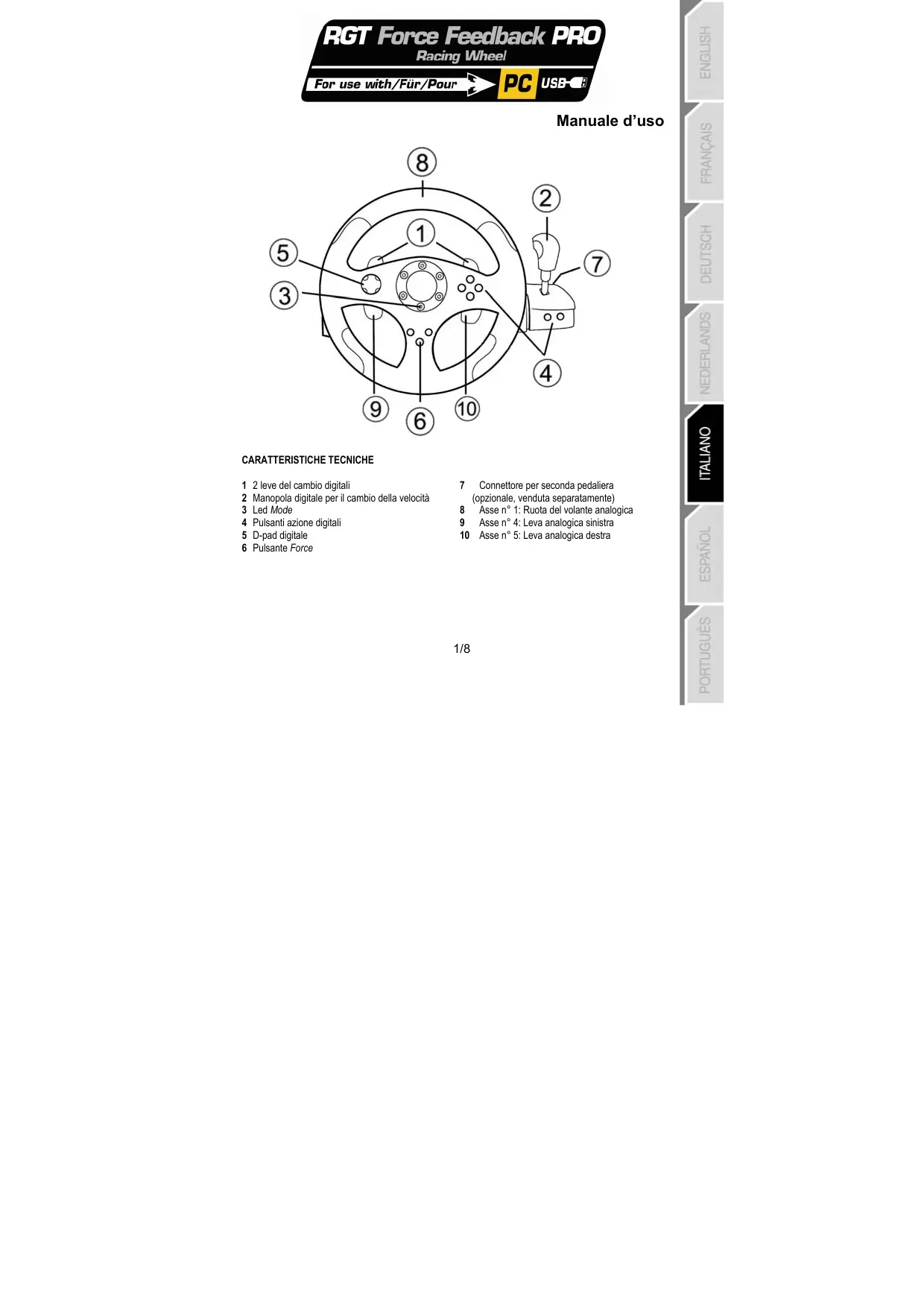 Connettore per seconda pedaliera (opzionale, venduta separatamente) 8 Asse n° 1: Ruota del volante analogica 9 Asse n° 4: Leva analogica sinistra 10 Asse n° 5: Leva analogica destra