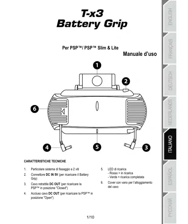 ATTENZIONE x Prima di utilizzare questo prodotto, leggete con attenzione questo documento e conservatelo per una futura consultazione. x Conserva il tuo Battery Grip un luogo asciutto e non esporlo a polvere o luce solare diretta. x Assicurati di rispettare le polarità e i tempi di ricarica. x Non attorcigliare o tirare troppo forte i connettori e i cavi. x Non versare alcun liquido sul Battery Grip e sui relativi connettori. x Non corto-circuitare il Battery Grip. x Non ricaricare il Battery Grip con alcun accessorio se non con l’adattatore da 5V accluso alla tua PSP™. x Non rimuovere mai la batteria interna della tua console PSP™ durante la ricarica tramite il Battery Grip. x Non cercare di smontare, bruciare o esporre ad alte temperature il Battery Grip.