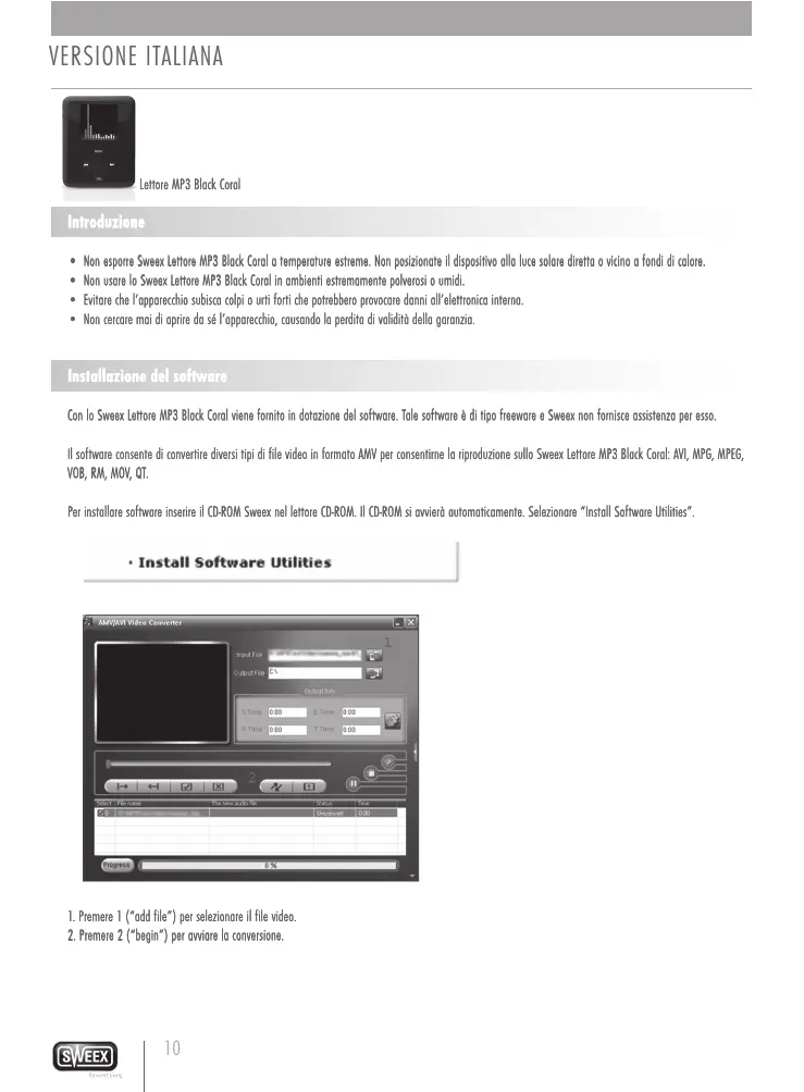 N on esporre Sweex Lettore MP3 Black Coral a temperature estreme. Non posizionate il dispositivo alla luce solare diretta o vicino a fondi di calore. Non usare lo Sweex Lettore MP3 Black Coral in ambienti estremamente polverosi o umidi. Evitare che l’apparecchio subisca colpi o urti forti che potrebbero provocare danni all’elettronica interna. Non cercare mai di aprire da sé l’apparecchio, causando la perdita di validità della garanzia. Installazione del software Con lo Sweex Lettore MP3 Black Coral viene fornito in dotazione del software. Tale software è di tipo freeware e Sweex non fornisce assistenza per esso. Il software consente di convertire diversi tipi di file video in formato AMV per consentirne la riproduzione sullo Sweex Lettore MP3 Black Coral: AVI, MPG, MPEG, VOB, RM, MOV, QT. Per installare software inserire il CD-ROM Sweex nel lettore CD-ROM. Il CD-ROM si avvierà automaticamente. Selezionare “Install Software Utilities”.