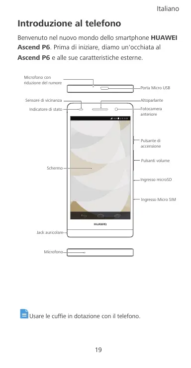 Italiano Introduzione al telefono Benvenuto nel nuovo mondo dello smartphone HUAWEI Ascend P6. Prima di iniziare, diamo un'occhiata al Ascend P6 e alle sue caratteristiche esterne. Microfono con riduzione del rumore Porta Micro USB Sensore di vicinanza Altoparlante Indicatore di stato Fotocamera anteriore Pulsante di accensione Pulsanti volume Schermo Ingresso microSD Ingresso Micro SIM Jack auricolare Microfono Usare le cuffie in dotazione con il telefono.