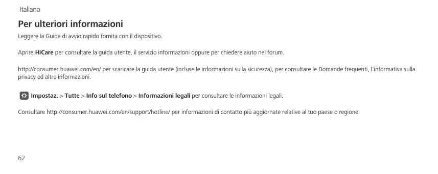 Italiano Per ulteriori informazioni Leggere la Guida di avvio rapido fornita con il dispositivo. Aprire HiCare per consultare la guida utente, il servizio informazioni oppure per chiedere aiuto nel forum. http://consumer.huawei.com/en/ per scaricare la guida utente (incluse le informazioni sulla sicurezza), per consultare le Domande frequenti, l'informativa sulla privacy ed altre informazioni. Impostaz. > Tutte > Info sul telefono > Informazioni legali per consultare le informazioni legali. Consultare http://consumer.huawei.com/en/support/hotline/ per informazioni di contatto più aggiornate relative al tuo paese o regione.