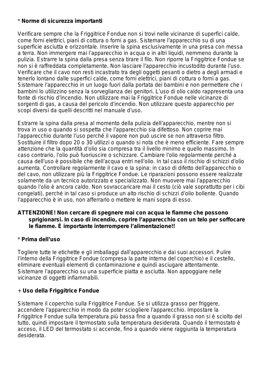Verificare sempre che la Friggitrice Fondue non si trovi nelle vicinanze di superfici calde, come forni elettrici, piani di cottura o fornì a gas. Sistemare l'apparecchio su di una superficie asciutta e orizzontale. Inserire la spina esclusivamente in una presa con messa a terra. Non immershere mai l'apparecchio in acqua o in altri liquidi, nemmeno durante la pulizia. Estrarre la spina alla presa perché tirare il filo. Non riporre la Friggitrice Fondue se non si è raffreddata completamente. Non lasciare l'apparecchio incustodito durante l'uso. Verificare che il cavo non resti incastrato tra degli oggetti pesanti o diaestro a degli armadi e tenerlo lontano delle superfici calde, come fornì elettrici, piani di cottura o fornì a gas. Sistemare l'apparecchio in un luogo fuori da la portata dei bambini e non permettere che i bambini lo utilizzato nella sorvegianza dei genitori. L'uso di olio caldo rappresenta una fonte di rischio d'incendio. Non utilizzato mai la Friggitrice Fondue nelle vicinanze di sorgenti di gas, a causa del pericolò d'incendio. Non utilizzato quello apparecchio per scopi diversi da quelli descritti nel manuale d'uso.