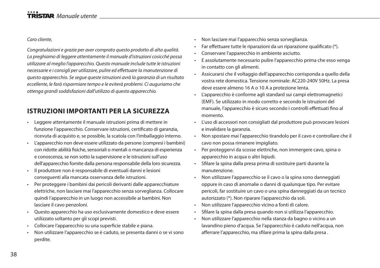 Tristar non è responsabile dei danni causati da: o Caduta dell’apparecchio. o Modifiche tecniche apportate dall’utilizzatore o da terze parti. o Uso improprio dell’apparecchio. o Normale usura dell’apparecchio. All’atto di una riparazione la garanzia originale di 24 mesi non verrà estesa né verrà completamente rinnovata. La presente garanzia ha valore legale solo per l’Europa e non annulla la direttiva europea 1944/44CE. Conservare sempre lo scontrino, senza di esso non si può utilizzare alcuna forma di garanzia. Eventuali danni causati dal mancato rispetto delle indicazioni fornite nel manuale di istruzioni annulleranno la garanzia. Tristar non è responsabile per qualsiasi danno conseguente. Tristar non è responsabile di danni materiali o lesioni personali causate da un uso improprio o da un mancato rispetto delle istruzioni di sicurezza. La pulizia eseguita secondo le indicazioni di questo manuale è l’unica manutenzione necessaria per questo apparecchio. Qualora l’apparecchio dovesse essere riparato, assicurarsi che la riparazione venga eseguita da una ditta autorizzata. Non si devono apportare modifiche o alterazioni all’apparecchio. Se si verificano problemi durante I 2 anni successivi all’acquisto, che sono coperti dalla garanzia del fabbricante, potete tornare al punto vendita e farvelo sostituire con un apparecchio nuovo. Per qualsiasi domanda o reclamo si prega di contattare il dettagliante presso cui avete acquistato l’apparecchio. Questo apparecchio è coperto da una garanzia di 24 mesi a partire dalla data di acquisto (ricevuta). Questa garanzia include soltanto difetti materiali o di fabbricazione. Se desiderate fare un reclamo, per favore restituite l’intero apparecchio al vostro negoziante nell’imballo originale, unitamente alla ricevuta di acquisto.