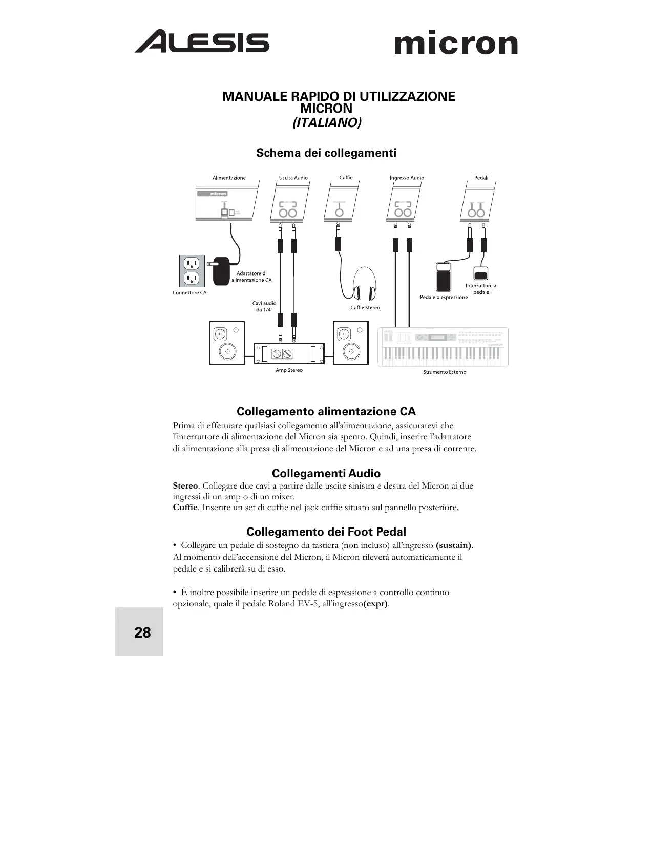 Scarica le istruzioni per il tuo Sintetizzatore in formato PDF gratuitamente! Trova il tuo manuale MICRON - ALESIS e riprendi in mano il tuo dispositivo elettronico. In questa pagina sono pubblicati tutti i documenti necessari per l'utilizzo del tuo dispositivo. MICRON del marchio ALESIS.