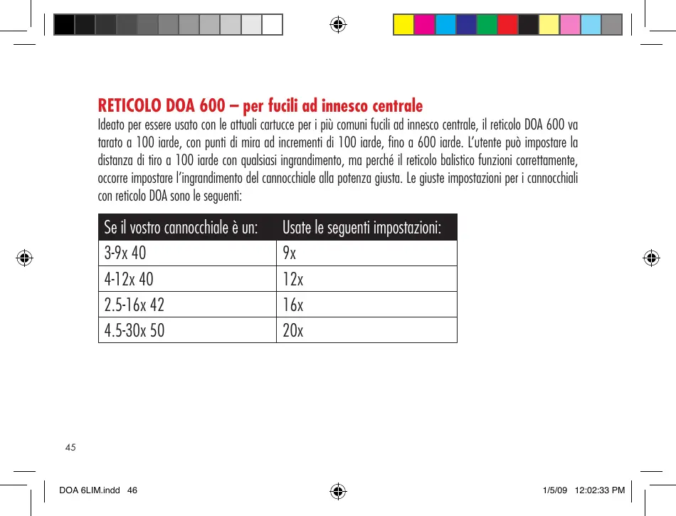 DOA 6LIM.indd 45 1/5/09 12:02:33 PM RETICOLO DOA 600 – per fucili ad innesco centrale Ideato per essere usato con le attuali cartucce per i più comuni fucili ad innesco centrale, il reticolo DOA 600 va tarato a 100 iarde, con punti di mira ad incrementi di 100 iarde, fino a 600 iarde. L’utente può impostare la distanza di tiro a 100 iarde con qualsiasi ingrandimento, ma perché il reticolo balistico funzioni correttamente, occorre impostare l’ingrandimento del cannocchiale alla potenza giusta. Le giuste impostazioni per i cannocchiali con reticolo DOA sono le seguenti: Se il vostro cannocchiale è un: 3-9x 40 4-12x 40 2.5-16x 42 4.5-30x 50 Usate le seguenti impostazioni: 12x 16x 20x