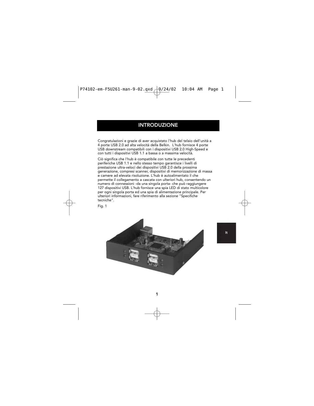 10:04 AM Page 10 P74102-em-F5U261-man-9-02.qxd 9/24/02 10:04 AM Page 1 INTRODUZIONE Congratulazioni e grazie di aver acquistato l'hub del telaio dell'unità a 4 porte USB 2.0 ad alta velocità della Belkin. L'hub fornisce 4 porte USB downstream compatibili con i dispositivi USB 2.0 High-Speed e con tutti i dispositivi USB 1.1 a bassa o a massima velocità. Ciò significa che l'hub è compatibile con tutte le precedenti periferiche USB 1.1 e nello stesso tempo garantisce i livelli di prestazione ultra-veloci dei dispositivi USB 2.0 della prossima generazione, compresi scanner, dispositivi di memorizzazione di massa e camere ad elevata risoluzione. L'hub è autoalimentato il che permette il collegamento a cascata con ulteriori hub, consentendo un numero di connessioni -da una singola porta- che può raggiungere 127 dispositivi USB. L'hub fornisce una spia LED di stato multicolore per ogni singola porta ed una spia di alimentazione principale. Per ulteriori informazioni, fare riferimento alla sezione "Specifiche tecniche". Fig. 1
