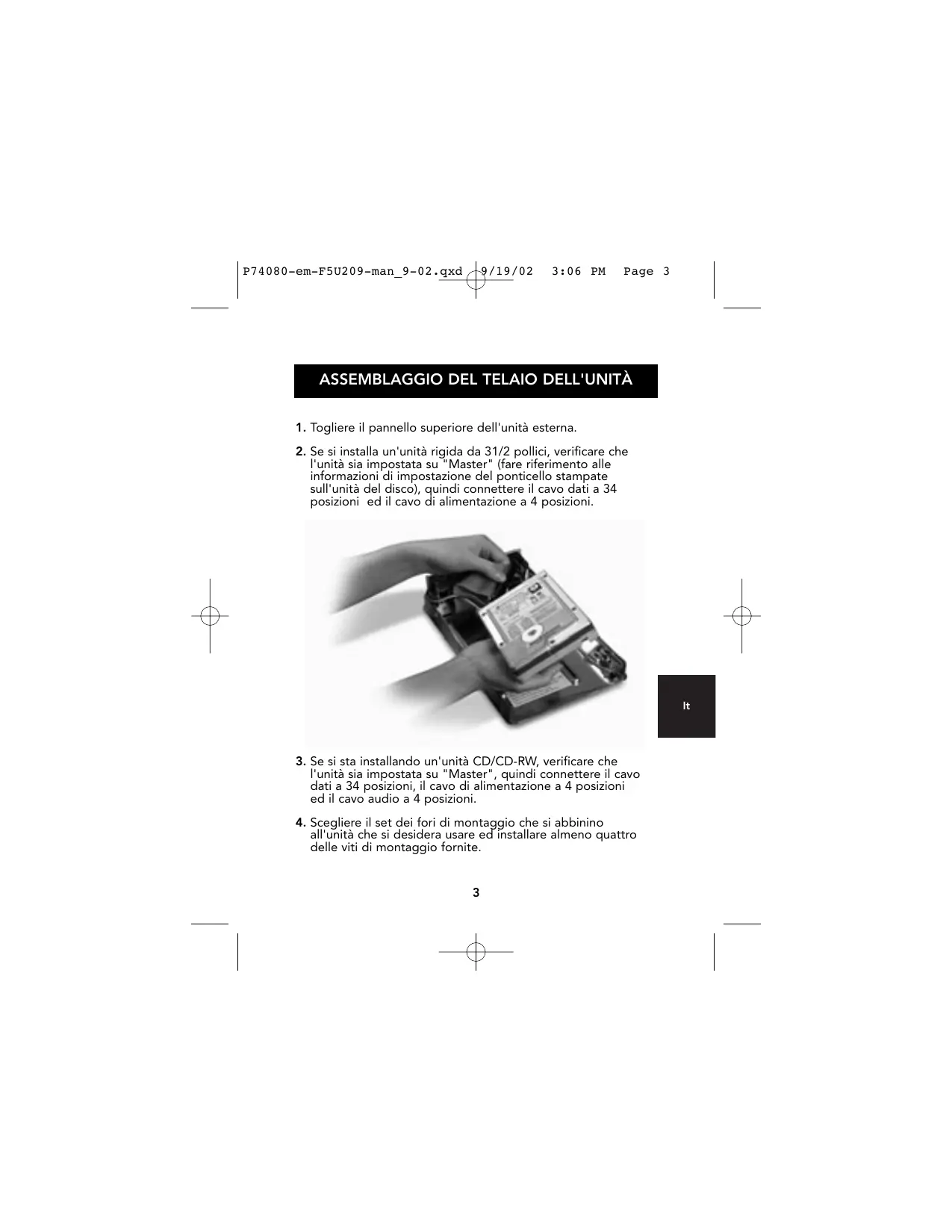 P74080-em-F5U209-man_9-02.qxd 9/19/02 3:06 PM Page 20 P74080-em-F5U209-man_9-02.qxd 9/19/02 3:06 PM Page 1 INTRODUZIONE Il telaio dell'unità esterna Hi-Speed USB 2.0 (l'unità esterna) è un'unità di memoria di massa compatta portatile che incorpora l'interfaccia ad alta velocità USB 2.0 (Universal Serial Bus 2.0). L'unità esterna garantisce un modo facile e veloce per aggiungere ulteriore capacità di memoria al computer. La caratteristica plug-and-play offre una grande convenienza quando si è in giro; l'unità esterna può essere facilmente collegata al computer dall'interfaccia USB e può essere sconnessa e riconnessa mentre il computer è in funzione. Nota: Per abilitare la modalità Hi-Speed USB 2.0 (480Mbps), il computer deve essere dotato di porte incorporate USB 2.0 o di una scheda dell'adattatore host USB 2.0.