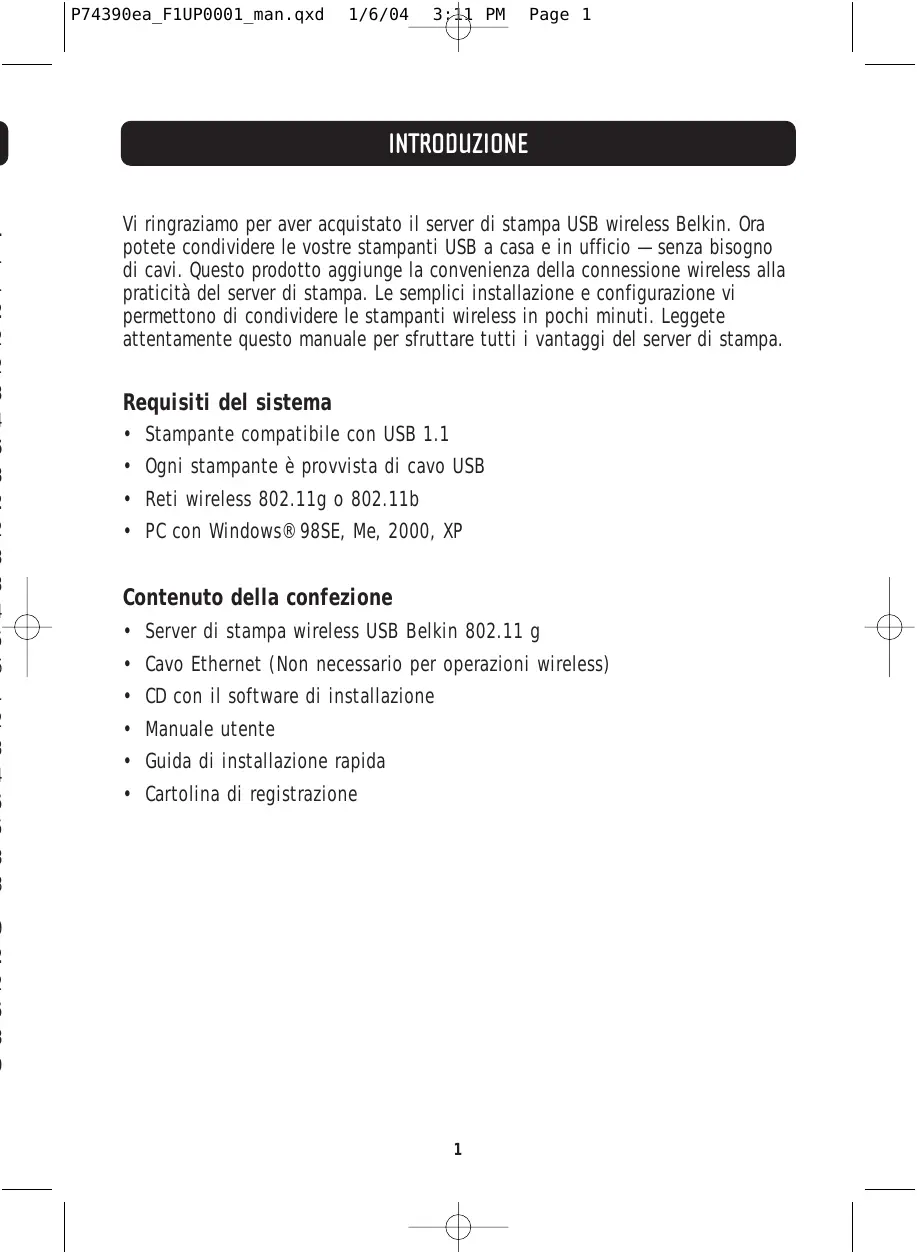 P74390ea_F1UP0001_man.qxd 1/6/04 3:11 PM Page 1 INTRODUZIONE Vi ringraziamo per aver acquistato il server di stampa USB wireless Belkin. Ora potete condividere le vostre stampanti USB a casa e in ufficio —senza bisogno di cavi. Questo prodotto aggiunge la convenienza della connessione wireless alla praticità del server di stampa. Le semplici installazione e configurazione vi permettono di condividere le stampanti wireless in pochi minuti. Leggete attentamente questo manuale per sfruttare tutti i vantaggi del server di stampa. Requisiti del sistema