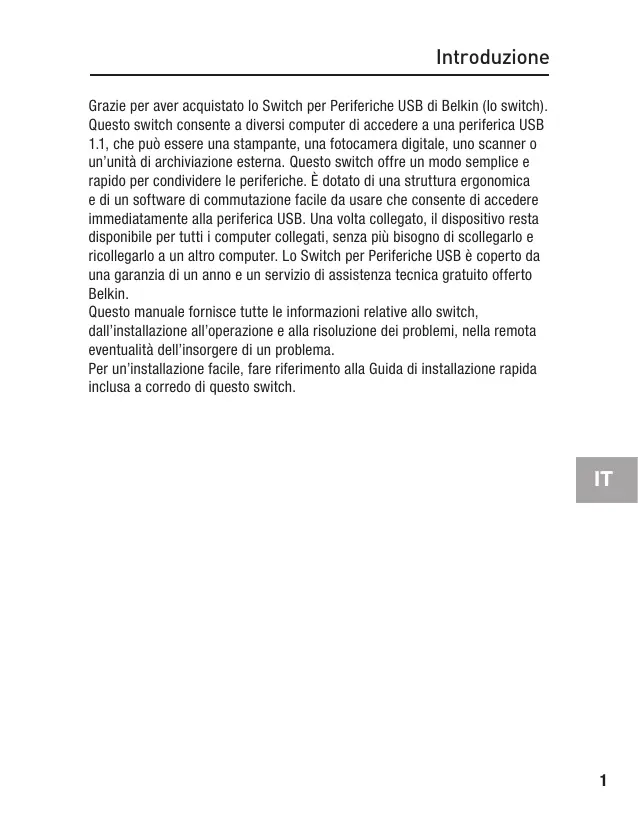 Introduzione Grazie per aver acquistato lo Switch per Periferiche USB di Belkin (lo switch). Questo switch consente a diversi computer di accedere a una periferica USB 1.1, che può essere una stampante, una fotocamera digitale, uno scanner o un’unità di archiviazione esterna. Questo switch offre un modo semplice e rapido per condividere le periferiche. È dotato di una struttura ergonomica e di un software di commutazione facile da usare che consente di accedere immediatamente alla periferica USB. Una volta collegato, il dispositivo resta disponibile per tutti i computer collegati, senza più bisogno di scollegarlo e ricollegarlo a un altro computer. Lo Switch per Periferiche USB è coperto da una garanzia di un anno e un servizio di assistenza tecnica gratuito offerto Belkin. Questo manuale fornisce tutte le informazioni relative allo switch, dall’installazione all’operazione e alla risoluzione dei problemi, nella remota eventualità dell’insorgere di un problema. Per un’installazione facile, fare riferimento alla Guida di installazione rapida inclusa a corredo di questo switch.