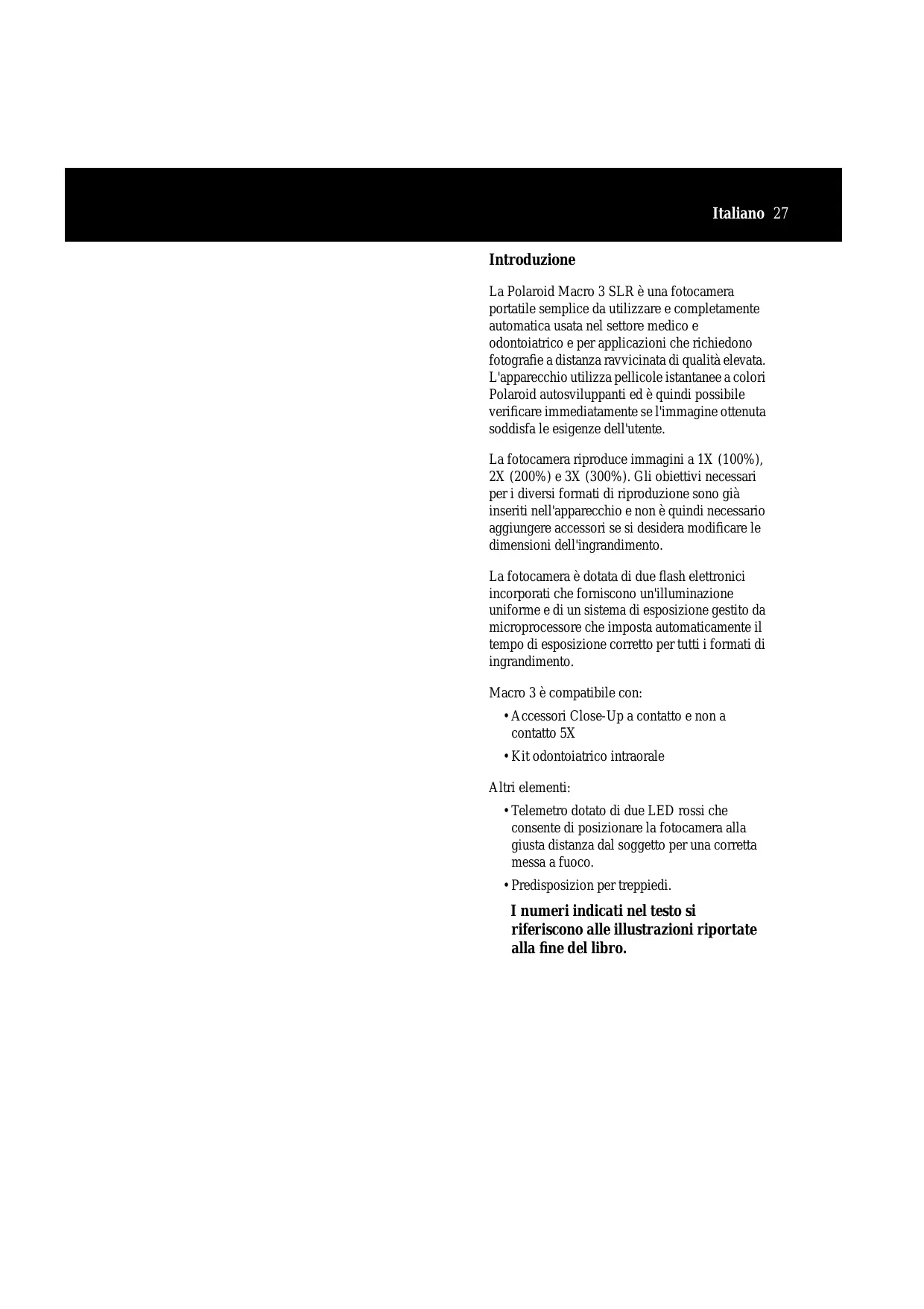 La profondeur de champ, ou distance de netteté du sujet, est limitée pour les gros plans. Si l’on prend le point le plus net comme distance de référence, la zone de profondeur de champ s’étend au-delà et en deçà de ce point dans une proportion de 50 % environ. Remarque : La vitesse d’obturation est de 1/50 seconde. Italiano 27 Introduzione La Polaroid Macro 3 SLR è una fotocamera portatile semplice da utilizzare e completamente automatica usata nel settore medico e odontoiatrico e per applicazioni che richiedono fotografie a distanza ravvicinata di qualità elevata. L'apparecchio utilizza pellicole istantanee a colori Polaroid autosviluppanti ed è quindi possibile verificare immediatamente se l'immagine ottenuta soddisfa le esigenze dell'utente. La fotocamera riproduce immagini a 1X (100%), 2X (200%) e 3X (300%). Gli obiettivi necessari per i diversi formati di riproduzione sono già inseriti nell'apparecchio e non è quindi necessario aggiungere accessori se si desidera modificare le dimensioni dell'ingrandimento. La fotocamera è dotata di due flash elettronici incorporati che forniscono un'illuminazione uniforme e di un sistema di esposizione gestito da microprocessore che imposta automaticamente il tempo di esposizione corretto per tutti i formati di ingrandimento. Macro 3 è compatibile con: