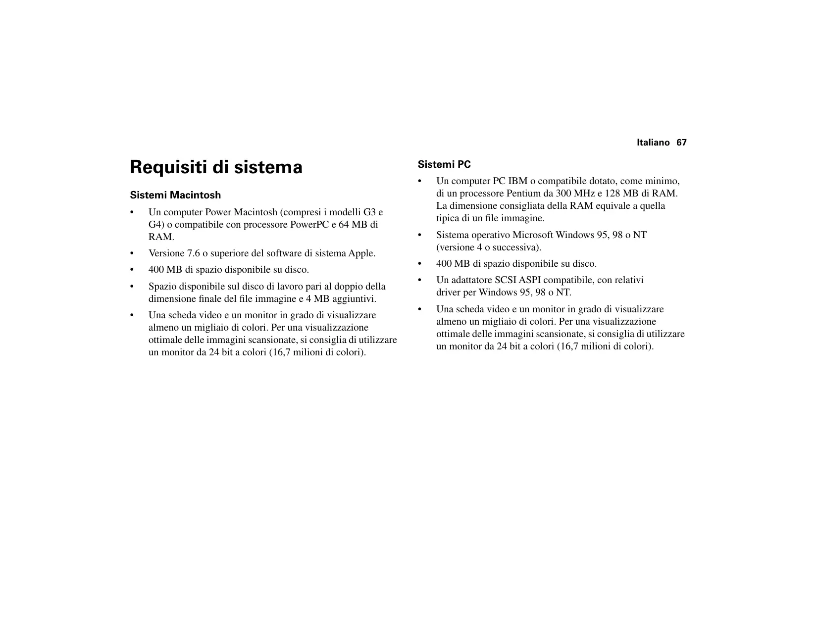 Per una visualizzazione ottimale delle immagini scansionate, si consiglia di utilizzare un monitor da 24 bit a colori (16,8 milioni di colori). Requisiti di sistema (pagina 67) Sistemi Macintosh