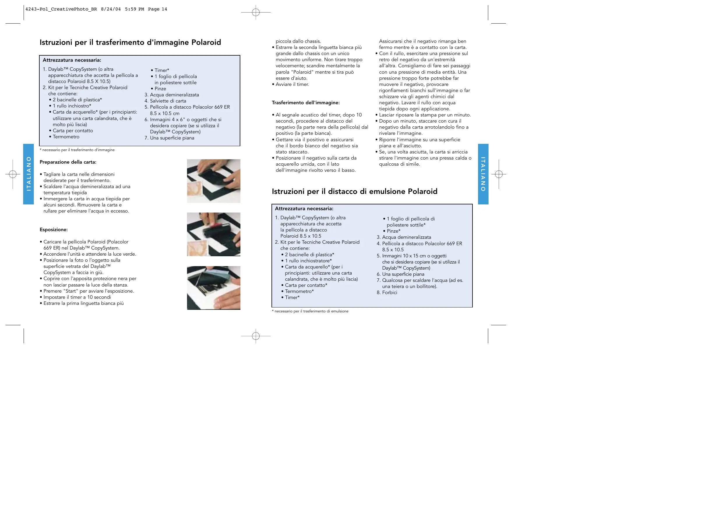 ventilato per mezzo di una finestra o un aspiratore. Glossario: Pellicola a distacco: La maggior parte dei consumatori pensa alla Polaroid come a quella pellicola quadrata con i bordi che si sviluppa all'interno di un "sandwich" composto da diversi strati (pellicola Polaroid 600). Le pellicole a distacco costituiscono la prima generazione di prodotti Polaroid e hanno in comune il fattore autopositivo, ma devono essere estratte manualmente dallo chassis: procedimento che consente di espandere gli agenti chimici su tutta la superficie della pellicola e di sviluppare la fotografia. Una volta completato lo sviluppo della fotografia il negativo dev'essere staccato dal positivo, scoprendo così l'immagine finale. Negativo Polaroid: La lunga immagine cartacea "negativa" che contiene la sacca verde degli agenti chimici, presenta una linguetta bianca con delle frecce nere. Nelle stampe Polaroid tradizionali questa parte viene comunemente gettata via. L'immagine viene impressa sul negativo e, una volta estratta dallo chassis e fatta passare attraverso i rulli per distribuirvi gli agenti chimici, l'immagine passa dal negativo al positivo. Ecco perché con il trasferimento d'immagine è necessario separarli anticipatamente: per impedire il passaggio dell'immagine al positivo e consentirne invece il trasferimento sulla carta da acquerello. Positivo Polaroid: L'immagine, detta anche "stampa". Nel trasferimento d'immagine, è un'immagine sbiadita del soggetto originale. Il positivo presenta quattro bordi bianchi e lisci attorno ai margini e un codice di fabbricazione sul retro, costituito da lettere e numeri. È molto simile alla stampa che si ottiene da una fotocamera da 35 mm. Durante lo sviluppo l'immagine passa dal negativo al positivo. Al termine del tempo di sviluppo il passaggio dell'immagine è completo ed è possibile staccare il positivo dal negativo, rivelando così l'immagine finale. Il positivo Polaroid presenta sulla parte superiore lo strato di emulsione, che può essere "staccato" durante il distacco di emulsione. Daylab™ CopySystem: Un prodotto di Daylab Corporation molto simile ad una normale fotocopiatrice, che però è in grado di copiare fotografie o soggetti su una pellicola a distacco Polaroid. È possibile acquistare il Daylab™ CopySystem in alcuni negozi specializzati e online. www.daylab.com. Sacca: Parte della pellicola a distacco che contiene gli agenti di sviluppo e che rompendosi li distribuisce sulla pellicola quando questa viene estratta dallo chassis e fatta passare attraverso i rulli. Polacolor 669 ER: La pellicola da utilizzare per il trasferimento d'immagine e il distacco di emulsione. Polaroid produce diversi tipi di pellicola in vari formati. La Polacolor 669 ER è una pellicola a distacco a colori da 3 1/4 x 4 1/4", reperibile online e nella maggior parte dei negozi specializzati. Carta calandrata: Carta da acquerello, in numerosi formati e stili differenti. Ai principianti Polaroid consiglia l'uso di una carta calandrata, che presenta meno asperità rispetto agli altri tipi di carta ed è pertanto più facile da utilizzare. Prendendo confidenza con il trasferimento d'immagine è possibile passare a carte e superfici più complesse. Emulsione Polaroid: Gli strati in materiale plastico della pellicola Polaroid; contengono le sostanze coloranti che costituiscono la fotografia. RISORSE: