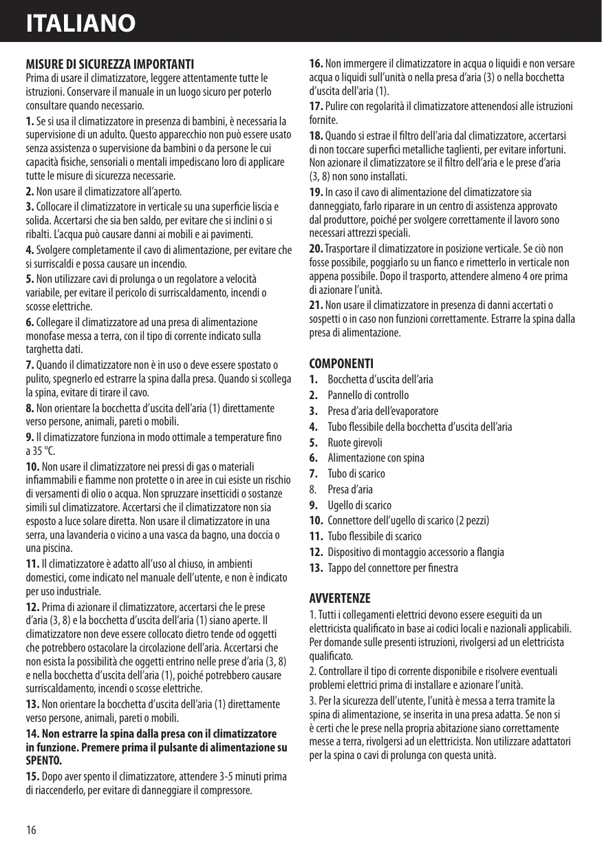 ITALIANO MISURE DI SICUREZZA IMPORTANTI Prima di usare il climatizzatore, leggere attentamente tutte le istruzioni. Conservare il manuale in un luogo sicuro per poterlo consultare quando necessario. 1. Se si usa il climatizzatore in presenza di bambini, è necessaria la supervisione di un adulto. Questo apparecchio non può essere usato senza assistenza o supervisione da bambini o da persone le cui capacità fisiche, sensoriali o mentali impediscano loro di applicare tutte le misure di sicurezza necessarie. 2. Non usare il climatizzatore all’aperto. 3. Collocare il climatizzatore in verticale su una superficie liscia e solida. Accertarsi che sia ben saldo, per evitare che si inclini o si ribalti. L’acqua può causare danni ai mobili e ai pavimenti. 4. Svolgere completamente il cavo di alimentazione, per evitare che si surriscaldi e possa causare un incendio. 5. Non utilizzare cavi di prolunga o un regolatore a velocità variabile, per evitare il pericolo di surriscaldamento, incendi o scosse elettriche. 6. Collegare il climatizzatore ad una presa di alimentazione monofase messa a terra, con il tipo di corrente indicato sulla targhetta dati. 7. Quando il climatizzatore non è in uso o deve essere spostato o pulito, spegnerlo ed estrarre la spina dalla presa. Quando si scollega la spina, evitare di tirare il cavo. 8. Non orientare la bocchetta d’uscita dell’aria (1) direttamente verso persone, animali, pareti o mobili. 9. Il climatizzatore funziona in modo ottimale a temperature fino a 35 °C. 10. Non usare il climatizzatore nei pressi di gas o materiali infiammabili e fiamme non protette o in aree in cui esiste un rischio di versamenti di olio o acqua. Non spruzzare insetticidi o sostanze simili sul climatizzatore. Accertarsi che il climatizzatore non sia esposto a luce solare diretta. Non usare il climatizzatore in una serra, una lavanderia o vicino a una vasca da bagno, una doccia o una piscina. 11. Il climatizzatore è adatto all’uso al chiuso, in ambienti domestici, come indicato nel manuale dell’utente, e non è indicato per uso industriale. 12. Prima di azionare il climatizzatore, accertarsi che le prese d’aria (3, 8) e la bocchetta d’uscita dell’aria (1) siano aperte. Il climatizzatore non deve essere collocato dietro tende od oggetti che potrebbero ostacolare la circolazione dell’aria. Accertarsi che non esista la possibilità che oggetti entrino nelle prese d’aria (3, 8) e nella bocchetta d’uscita dell’aria (1), poiché potrebbero causare surriscaldamento, incendi o scosse elettriche. 13. Non orientare la bocchetta d’uscita dell’aria (1) direttamente verso persone, animali, pareti o mobili. 14. Non estrarre la spina dalla presa con il climatizzatore in funzione. Premere prima il pulsante di alimentazione su SPENTO. 15. Dopo aver spento il climatizzatore, attendere 3-5 minuti prima di riaccenderlo, per evitare di danneggiare il compressore. 16