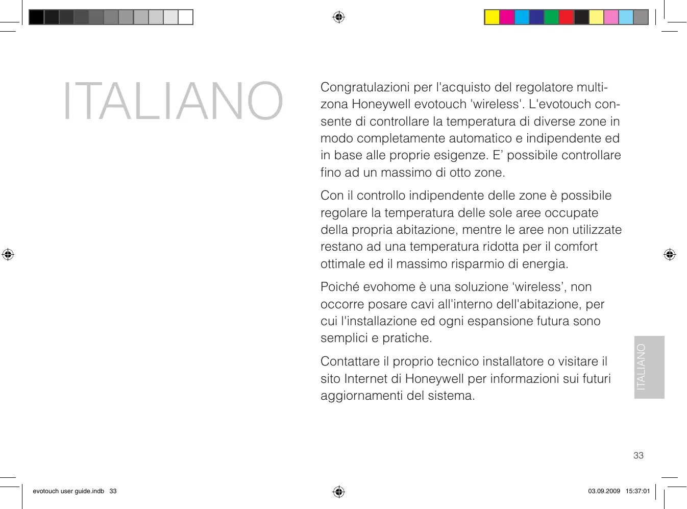 Congratulations per l'acquisto del regolatore multizona Honeywell evotouch 'wireless'. L'evotouch consente di controllare la temperatura di diverse zone in modo completamente automatico e indipendente ed in base alle proprie esigenze. E' possibile controllare fino ad un massimo diotto zone.