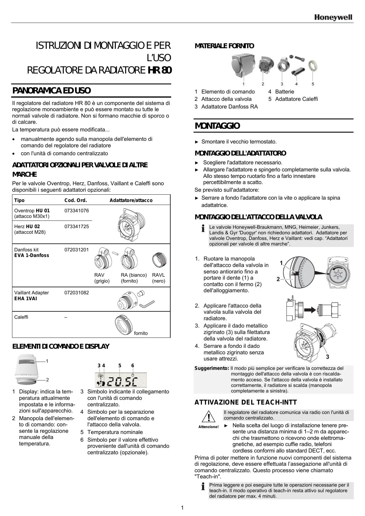 Scarica le istruzioni per il tuo Termostato in formato PDF gratuitamente! Trova il tuo manuale HR80 - HONEYWELL e riprendi in mano il tuo dispositivo elettronico. In questa pagina sono pubblicati tutti i documenti necessari per l'utilizzo del tuo dispositivo. HR80 del marchio HONEYWELL.