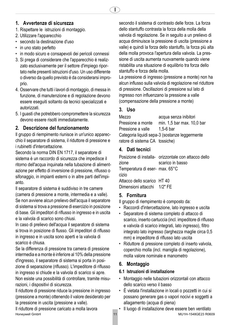 2. Descrizione del funzionamento Il gruppo di riempimento riunisce in un'unico apparecchio il separatore di sistema, il riduttore di pressione e i rubinetti d'intercettazione. Secondo la norma DIN EN 1717, il separatore di sistema è un raccordo di sicurezza che impedisce il ritorno dell'acqua inquinata nella tubazione di alimentazione per effetto di inversione di pressione, riflusso o sifonaggio, in impianti esterni o in altre parti dell'impianto. Il separatore di sistema è suddiviso in tre camere (camera di pressione a monte, intermedia e a valle). Se non avviene alcun prelievo dell'acqua il separatore di sistema si trova a pressione di esercizio in posizione di base. Gli impeditori di riflusso in ingresso e in uscita e la valvola di scarico sono chiusi. In caso di prelievo dell'acqua il separatore di sistema si trova in posizione di flusso. Gli impeditori di riflusso in ingresso e in uscita sono aperti e la valvola di scarico è chiusa. Se la differenza di pressione tra camera di pressione intermedia e a monte è inferiore al 10% della pressione d'ingresso, il separatore di sistema si porta in posizione di separazione (riflusso). L'impeditore di riflusso in ingresso si chiude e la valvola di scarico si apre. Non esiste una possibilità di controllare, tramite misurazioni, i dispositivi di sicurezza. Il riduttore di pressione riduce la pressione in ingresso (pressione a monte) ottenendo il valore desiderato per la pressione in uscita (pressione a valle). Il riduttore di pressione caricato a molla lavora Honeywell GmbH