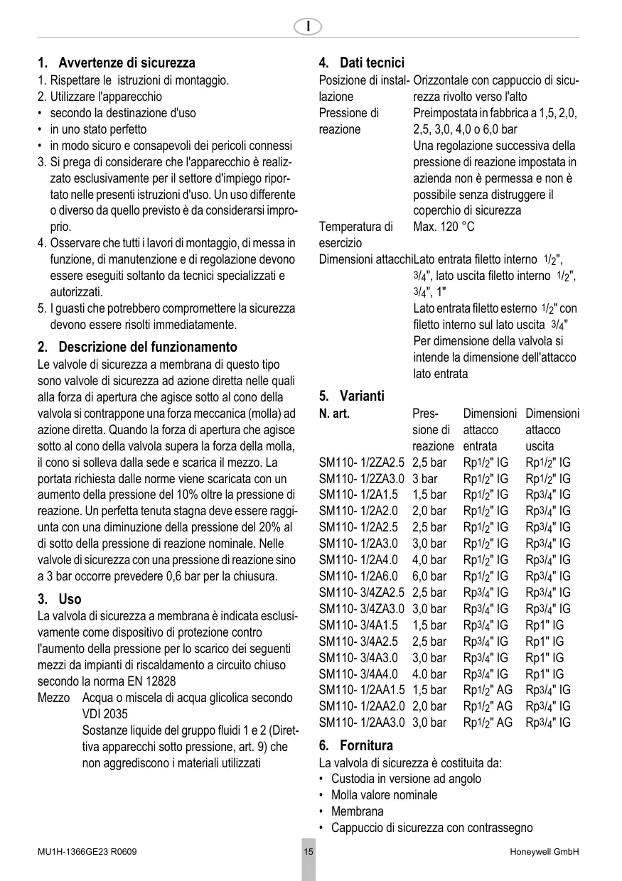 6. Fornitura La valvola di sicurezza è costituita da: • Custodia in versione ad angolo • Molla valore nominale • Membrana • Cappuccio di sicurezza con contrassegno 15
