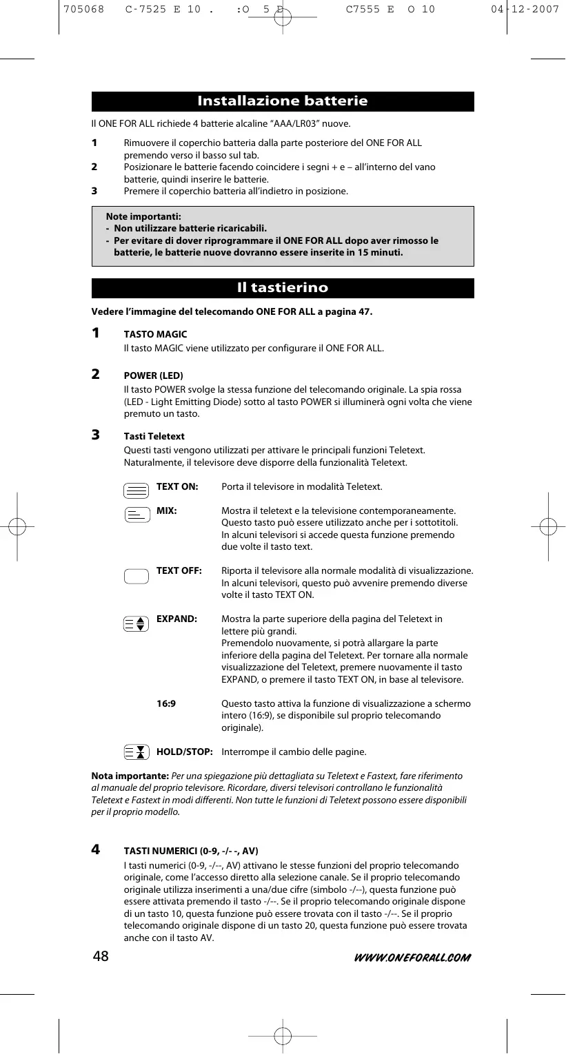 URC 7525 - Telecomando universale ONEFORALL - Manuale utente e istruzioni gratuiti