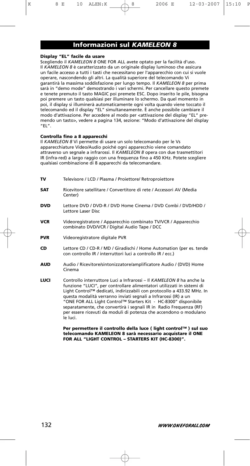Une fois les piles insérées, le KAMELEON 8 se trouve en mode “démo” et affiche les touches de plusieurs modes. La programmation de la télécommande annulera ce mode “Démo” (appuyez sur la touche MAGIC pendant environ 3 secondes puis appuyez et relâchez la touche ESC). Quand des piles sont de nouveau insérées, il est nécessaire d’appuyer d’abord sur une touche pour que l’écran s’allume. Dès lors, il s’éclairera automatiquement en touchant simultanément l’écran et la télécommande. Il est possible de changer le mode d’activation de l’écran ”EL”. Pour passer au mode d’activation de l’écran “EL“ en appuyant sur une touche, voir page 56, section “Réglage du mode d’activation de l’écran “EL“. Commande jusqu’à 8 appareils Votre KAMELEON 8 est conçu pour vous permettre d’utiliser une seule télécommande pour commander vos appareils audios & vidéos; à savoir, tout appareil fonctionnant avec un signal infrarouge. Votre KAMELEON 8 est doté de deux émetteurs IR (infrarouges) puissants permettant un champ d’action maximal et une capacité haute-fréquence allant jusqu’à 450 kHz. Vous pouvez choisir n’importe quelle combinaison de 8 appareils télécommandables.